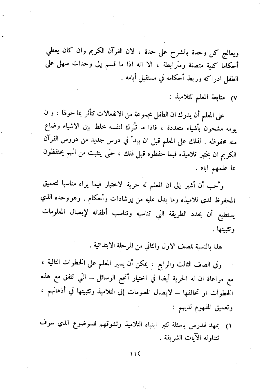 ويعالج كل وحدة بالشرح على حدة؛ لأن القرآن الكريم وإن كان يعطي أحكاما كلية متصلة ومترابطة، إلا أنه إذا ما قسم إلى وحدات سهل على الطفل إدراكه وربط أحكامه في مستقبل أيامه.