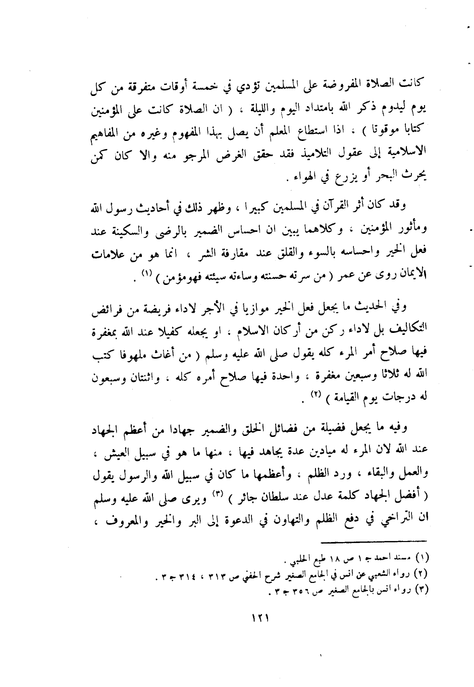 وفيه ما يجعل فضيلة من فضائل الخلق والضمير جهادا من أعظم الجهاد عند الله؛ لأن المرء له ميادين عدة يجاهد فيها، منها ما هو في سبيل العيش، والعمل والبقاء، ورد الظلم، وأعظمها ما كان في سبيل الله والرسول يقول: "أفضل الجهاد كلمة عدل عند سلطان جائر" 3 ويرى -صلى الله عليه وسلم- أن التراخي في دفع الظلم والتهاون في الدعوة إلى البر والخير والمعروف،