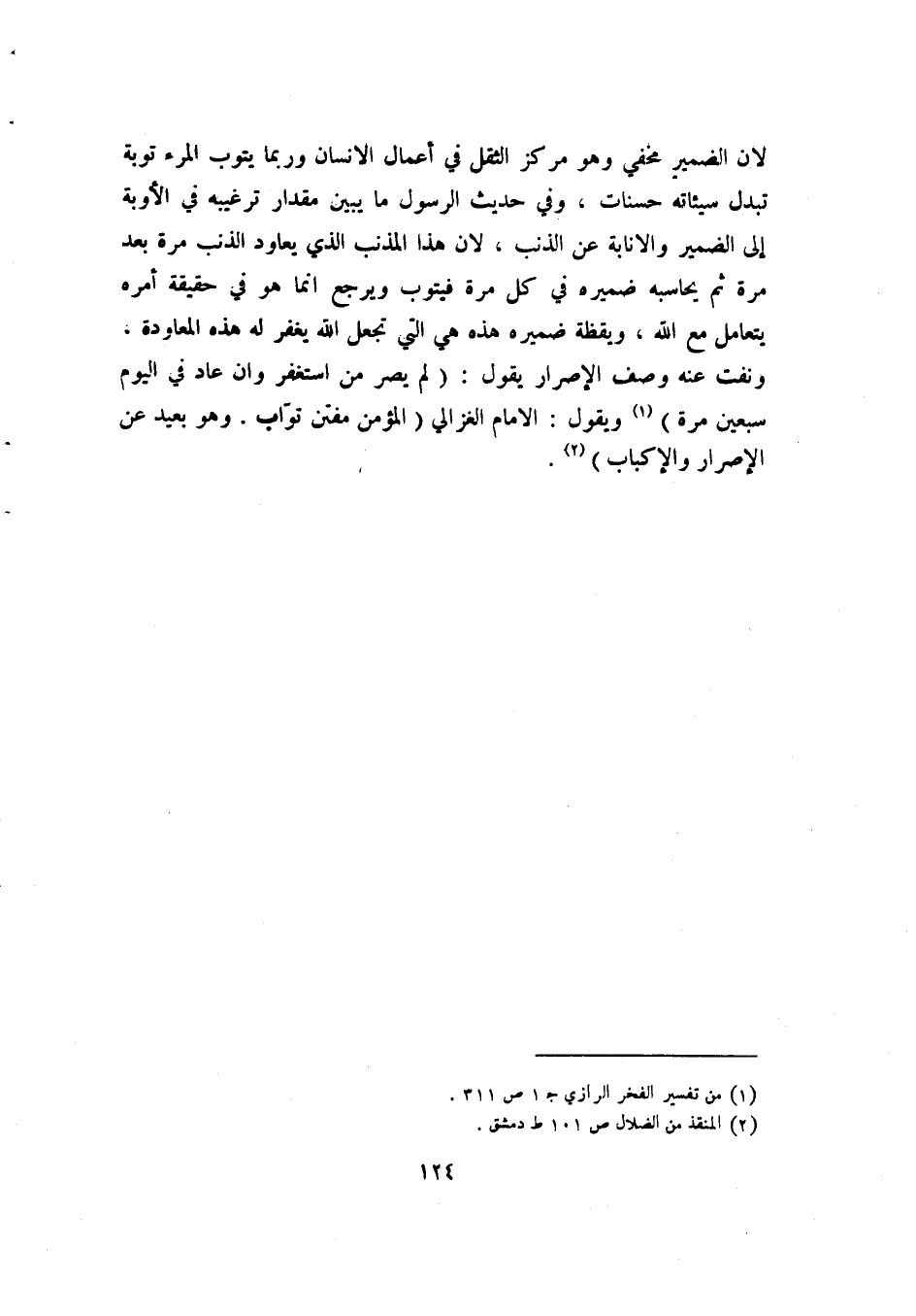 لأن الضمير مخفي وهو مركز الثقل في أعمال الإنسان, وربما يتوب المرء توبة تبدل سيئاته حسنات، وفي حديث الرسول ما يبين مقدار ترغيبه في الأوبة إلى الضمير والإنابة على الذنب؛ لأن هذا المذنب الذي يعاود الذنب مرة بعد مرة ثم يحاسبه ضميره في كل مرة فيتوب ويرجع إنما هو في حقيقة أمره يتعامل مع الله، ويقظة ضميره هذه هي التي تجعل الله يغفر له هذه المعاودة، ونفت عنه وصف الإصرار يقول: "لم يصر من استغفر وإن عاد في اليوم سبعين مرة"1 ويقول: الإمام الغزالي "المؤمن مفتن تواب. وهو بعيد عن الإصرار والإكباب"2.