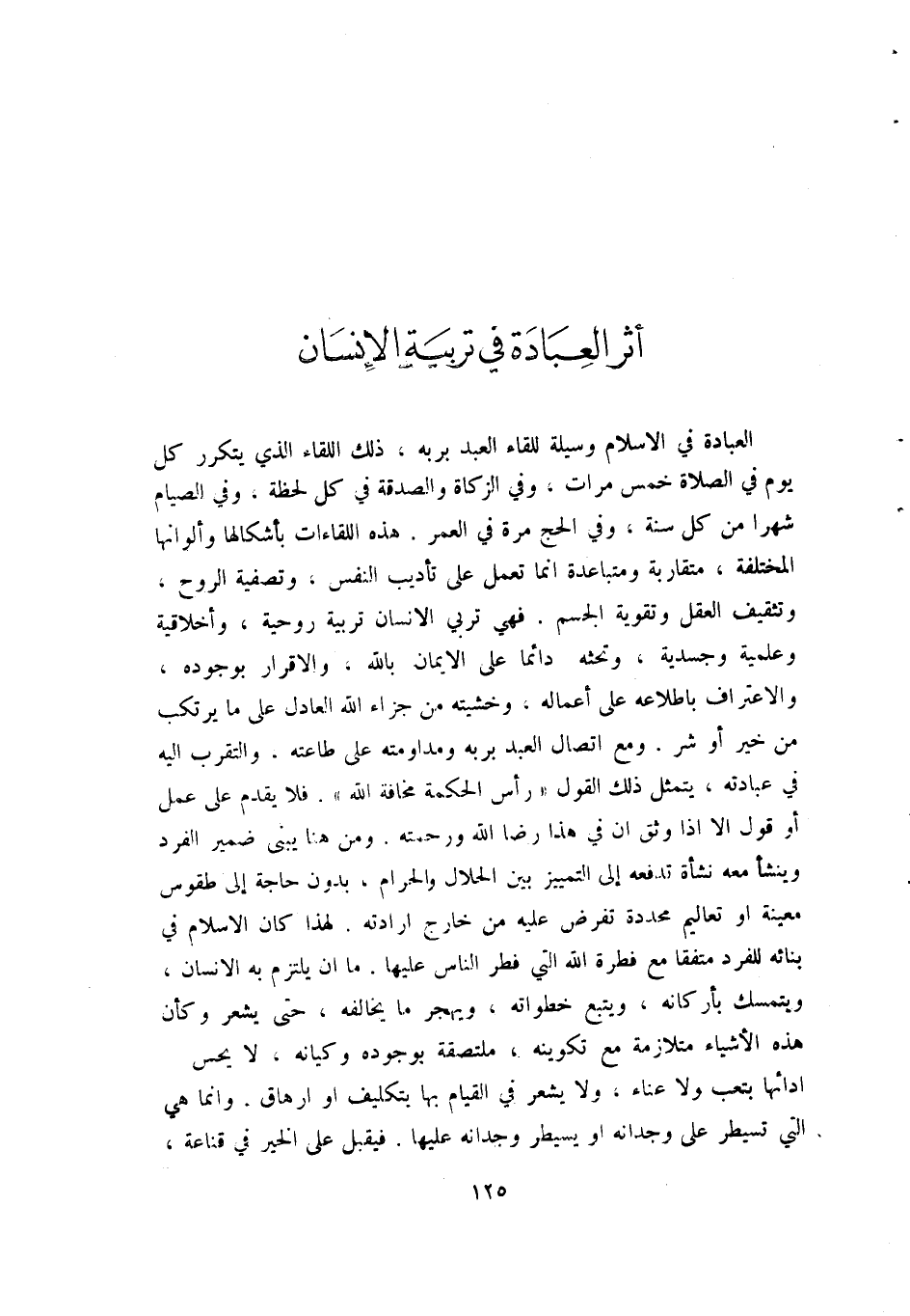 العبادة في الإسلام وسيلة للقاء العبد بربه، ذلك اللقاء الذي يتكرر كل يوم في الصلاة خمس مرات، وفي الزكاة والصدقة في كل لحظة، وفي الصيام شهرا من كل سنة، وفي الحج مرة في العمر. هذه اللقاءات بأشكالها وألوانها المختلفة، متقاربة ومتباعدة إنما تعمل على تأديب النفس، وتصفية الروح، وتثقيف العقل وتقوية الجسم. فهي تربي الإنسان تربية روحية، وأخلاقية وعلمية وجسدية، وتحثه دائما على الإيمان بالله. والإقرار بوجوده، والاعتراف باطلاعه على أعماله. وخشيته من جزاء الله العادل على ما يرتكب من خير أو شر. ومع اتصال العبد بربه ومداومته على طاعته. والتقرب إليه في عبادته، يتمثل في ذلك القول "رأس الحكمة مخافة الله" فلا يقدم على عمل أو قول إذا وثق أن في هذا رضا الله ورحمته. ومن هنا يبنى ضمير الفرد وينشأ معه نشأة تدفعه إلى التمييز بين الحلال والحرام، بدون حاجة إلى طقوس معينة أو تعاليم محددة تفرض عليه من خارج إرادته. لهذا كان الإسلام في بنائه للفرد متفقا مع فطرة الله التي فطر الناس عليها، ما إن يلتزم به الإنسان، ويتمسك بأركانه، ويتبع خطواته، ويهجر ما يخالفه، حتى يشعر وكأن هذه الأشياء متلازمة مع تكوينه، ملتصقة بوجوده وكيانه، لا يحس أدائها بتعب ولا عناء، ولا يشعر في القيام بها بتكليف أو إرهاق، وإنما هي التي تسيطر على وجدانه أو يسيطر وجدانه عليها. فيقبل على الخير في قناعة،