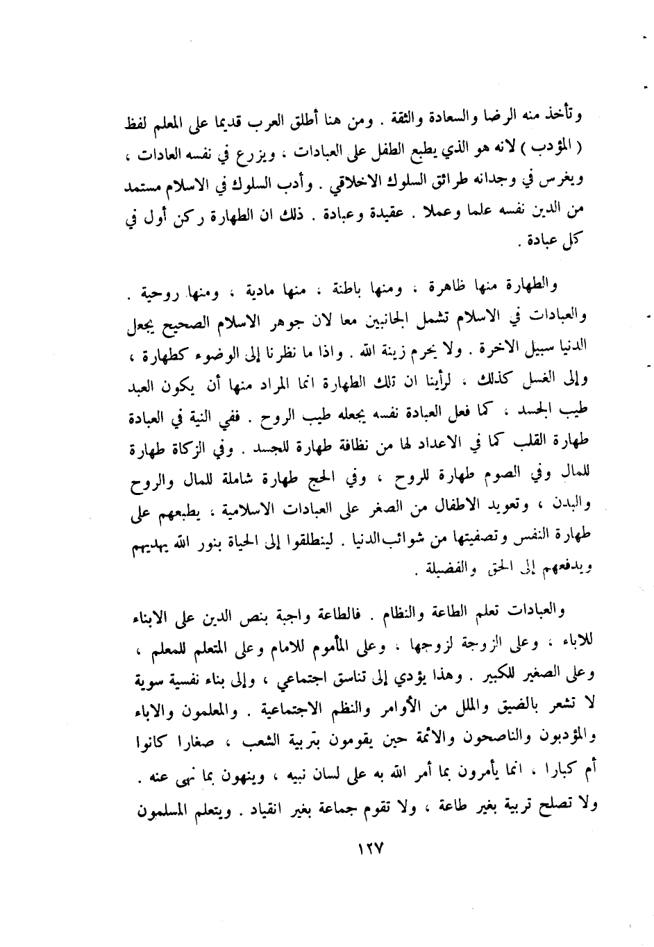 وتأخذ منه الرضا والسعادة والثقة. ومن هنا أطلق العرب قديما على المعلم لفظ "المؤدب" لأنه هو الذي يطبع الطفل على العبادات، ويزرع في نفسه العادات، ويغرس في وجدانه طرائق السلوك الأخلاقي. وأدب السلوك في الإسلام مستمد من الدين نفسه علما وعملا، عقيدة وعبادة. ذلك أن الطهارة ركن أول في كل عبادة.