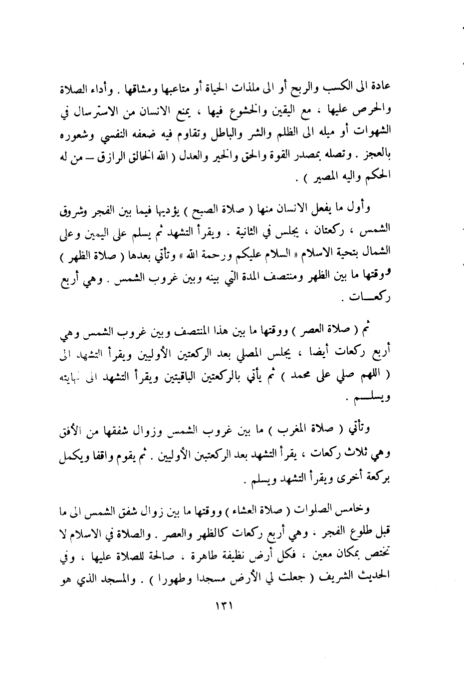 وأول ما يفعل الإنسان منها "صلاة الصبح" يؤديها فيما بين الفجر وشروق الشمس، ركعتان، يجلس في الثانية، ويقرأ التشهد ثم يسلم على اليمين وعلى الشمال بتحية الإسلام "السلام عليكم ورحمة الله" وتأتي بعدهها "صلاة الظهر" ووقتها ما بين الظهر ومنتصف المدة التي بينه وبين غروب الشمس. وهي أربع ركعات.
