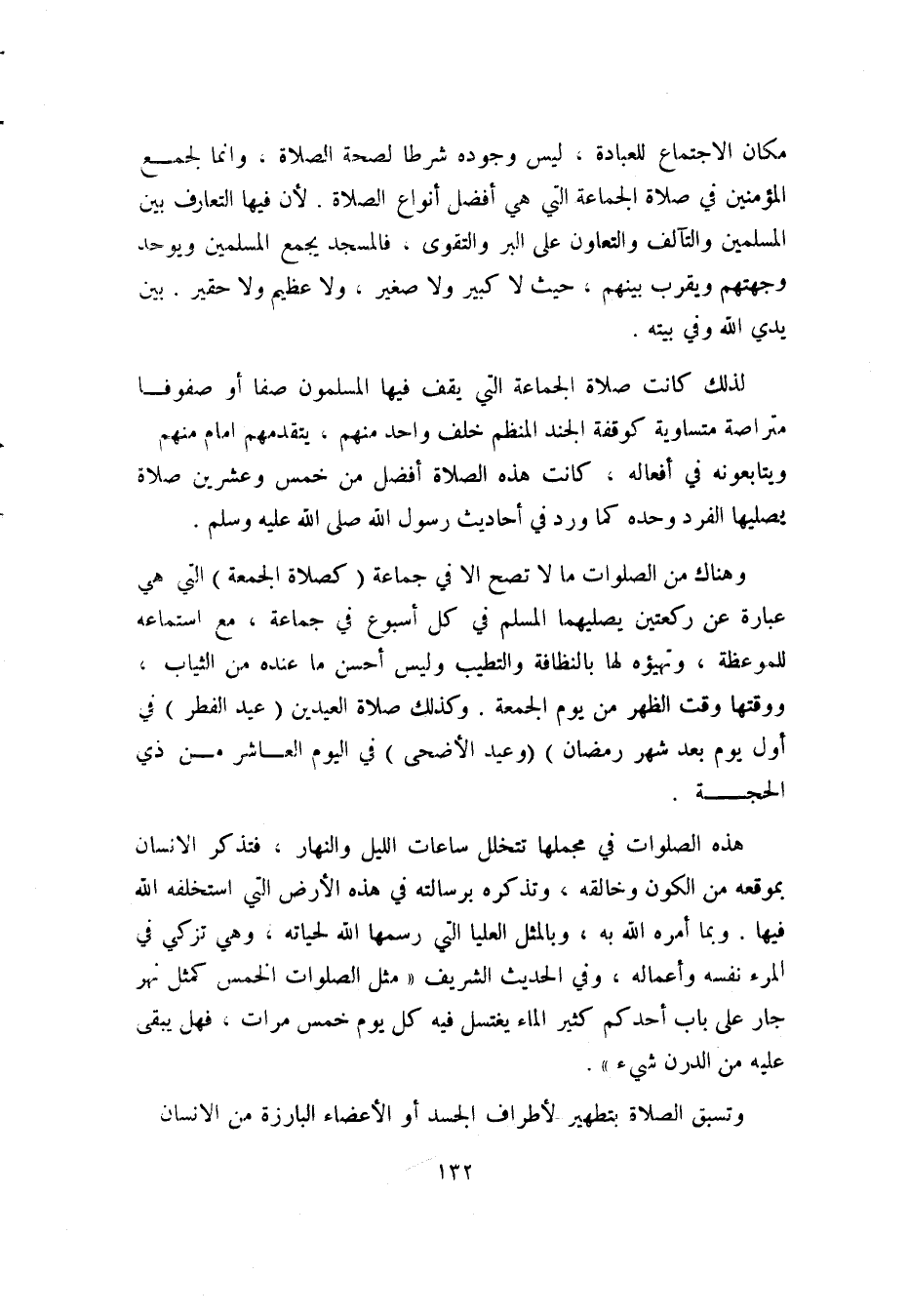 لذلك كانت صلاة الجماعة التي يقف فيها المسلمون صفا أو صفوفا متراصة متساوية كوقفة الجند المنظم خلف واحد منهم، يتقدمهم إمام منهم ويتابعونه في أفعاله، كانت هذه الصلاة أفضل من خمس وعشرين صلاة يصليها الفرد وحده كما ورد في أحاديث رسول الله -صلى الله عليه وسلم.