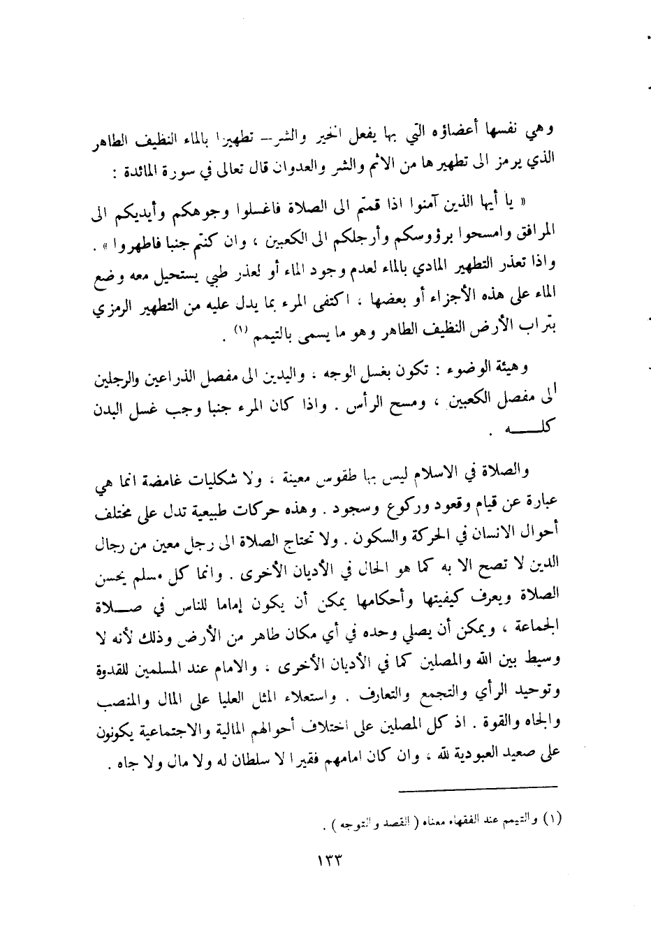 والصلاة في الإسلام ليس بها طقوس معينة، ولا شكليات غامضة إنما هي عبارة عن قيام وقعود وركوع وسجود. وهذه حركات طبيعية تدل على مختلف أحوال الإنسان في الحركة والسكون. ولا تحتاج الصلاة إلى رجل معين من رجال الدين لا تصح إلا به كما هو الحال في الأديان الأخرى. وإنما كل مسلم يحسن الصلاة ويعرف كيفيتها وأحكامها يمكن أن يكون إماما للناس في صلاة الجماعة، ويمكن أن يصلي وحده في أي مكان طاهر من الأرض؛ وذلك لأنه لا وسيط بين الله والمصلين كما في الأديان الأخرى، والإمام عند المسلمين للقدوة وتوحيد الرأي والتجمع والتعارف. واستعلاء المثل العليا على المال والمنصب والجاه والقوة. إذ كل المصلين على اختلاف أحوالهم المالية والاجتماعية يكونون على صعيد العبودية لله، وإن كان إمامهم فقيرا لا سلطان له ولا مال ولا جاه.