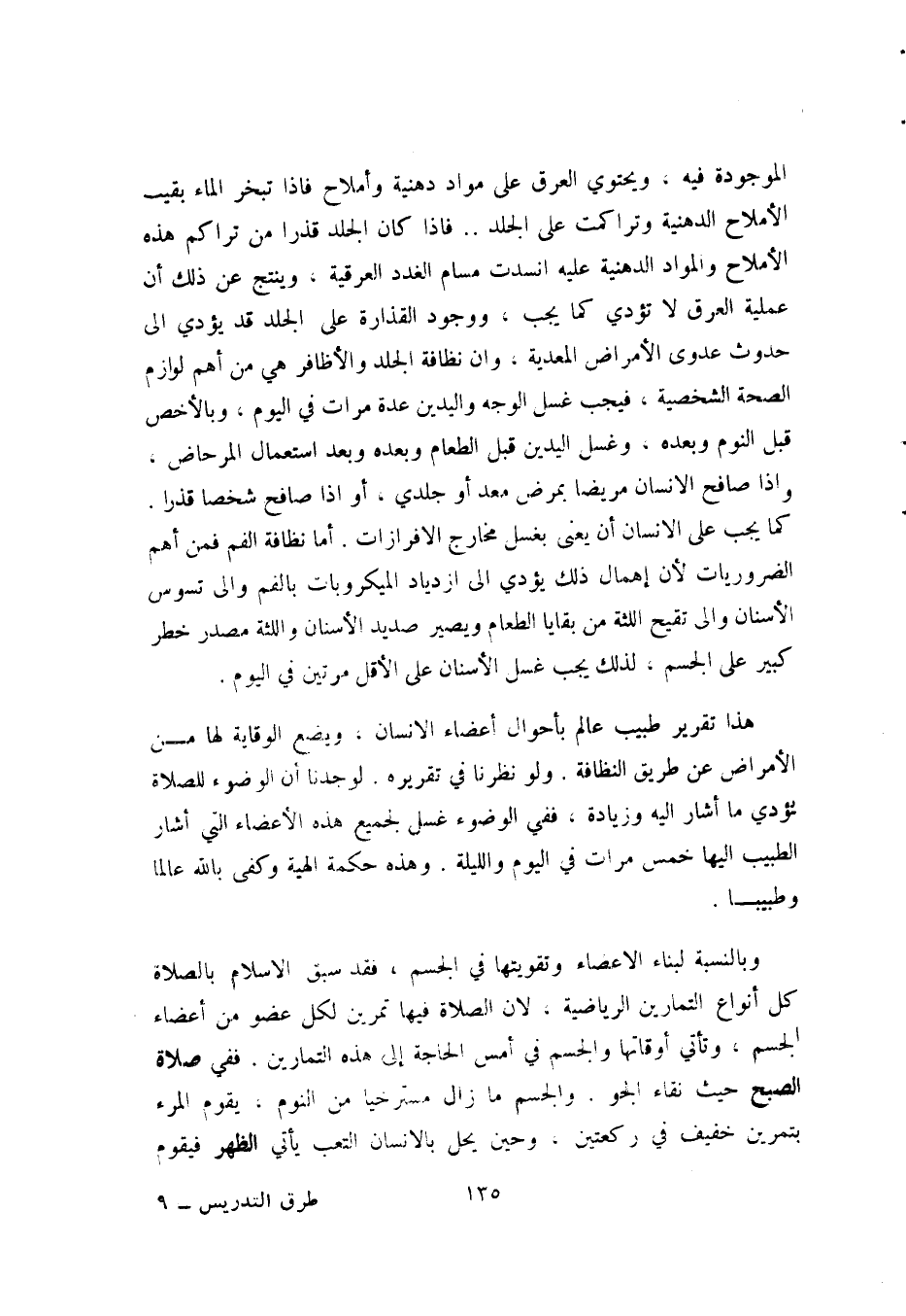 الموجودة فيه، ويحتوي العرق على مواد دهنية وأملاح فإذا تبخر الماء بقيت الأملاح الدهنية وتراكمت على الجلد ... فإذا كان الجلد قذرا من تراكم هذه الأملاح والمواد الدهنية عليه انسدت مسام الغدد العرقية، وينتج عن ذلك أن عملية العرق لا تؤدى كما يجب، ووجود القذارة على الجلد قد يؤدي إلى حدوث عدوى الأمراض المعدية، وأن نظافة الجلد والأظافر هي من أهم لوازم الصحة الشخصية، فيجب غسل الوجه واليدين عدة مرات في اليوم، وبالأخص قبل النوم وبعده، وغسل اليدين قبل الطعام وبعده وبعد استعمال المرحاض، وإذا صافح الإنسان مريضا بمرض معد أو جلدي، أو إذا صافح شخصا قذرا.