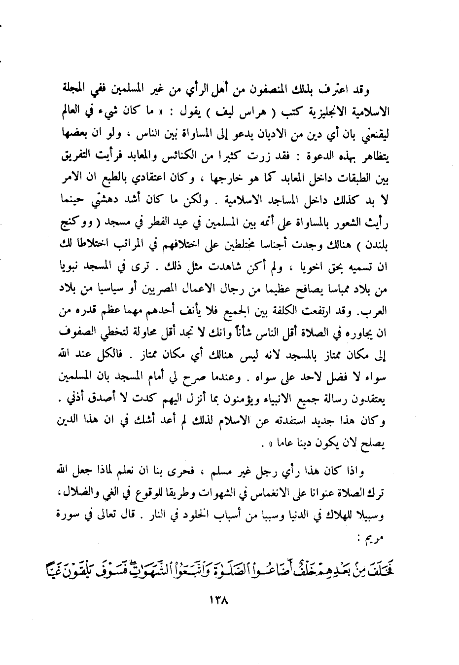 وقد اعترف بذلك المنصفون من أهل الرأي من غير المسلمين ففي المجلة الإسلامية الإنجليزية كتب "هراس ليف" يقول: "ما كان شيء في العالم ليقنعني بأن أي دين من الأديان يدعو إلى المساوة بين الناس، ولو أن بعضها يتظاهر بهذه الدعوة: فقد زرت كثيرا من الكنائس والمعابد فرأيت التفريق بين الطبقات داخل المعابد كما هو خارجها، وكان اعتقادي بالطبع أن الأمر لا بد كذلك داخل المساجد الإسلامية. ولكن ما كان أشد دهشتي حينما رأيت الشعور بالمساواة على أتمه بين المسلمين في عيد الفطر في مسجد "ووكنج بلندن" هنالك وجدت أجناسا مختلطين على اختلافهم في المراتب اختلاطا لك أن تسميه بحق أخويا، ولم أكن شاهدت مثل ذلك. ترى في المسجد نبويا من بلاد ممباسا يصافح عظيما من رجال الأعمال المصريين أو سياسيا من بلاد العرب. وقد ارتفعت الكلفة بين الجميع فلا يأنف أحدهم مهما عظم قدره من أن يجاوره في الصلاة أقل الناس شأنا, وإنك لا تجد أقل محاولة لتخطي الصفوف إلى مكان ممتاز بالمسجد؛ لأنه ليس هنالك أي مكان ممتاز. فالكل عند الله سواء لا فضل لأحد على سواه، وعندما صرح لي إمام المسجد بأن المسلمين يعتقدون رسالة جمع الأنبياء ويؤمنون بما أنزل إليهم كدت لا أصدق أذني. وكان هذا جديد استفدته عن الإسلام لذلك لم أعد أشك في أن هذا الدين يصلح لأن يكون دينا عاما".