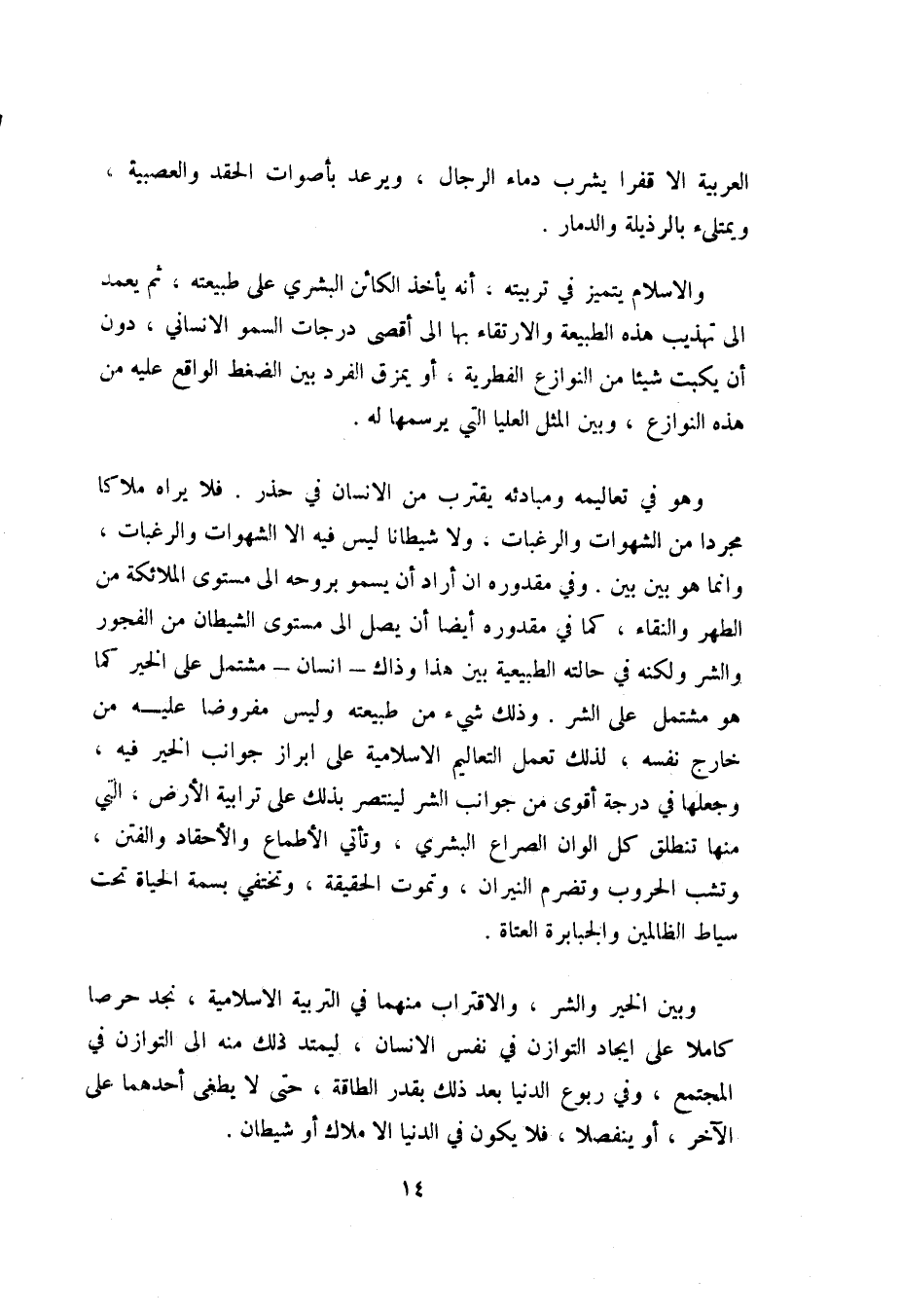 وإنما هو بين بين. وفي مقدوره إن أراد أن يسمو بروحه إلى مستوى الملائكة من الطهر والنقاء، كما في مقدوره أيضا أن يصل إلى مستوى الشيطان من الفجور والشر ولكنه في حالته الطبيعية بين هذا وذاك -إنسان- مشتمل على الخير كما هو مشتمل على الشر. وذلك شيء من طبيعته وليس مفروضا عليه من خارج نفسه، لذلك تعمل التعاليم الإسلامية على إبراز جوانب الخير فيه، وجعلها في درجة أقوى من جوانب الشر لينتصر بذلك على ترابية الأرض، التي منها تنطلق كل ألوان الصراع البشري، وتأتي الأطماع والأحقاد والفتن، وتشب الحروب وتضرم النيران، وتموت الحقيقة، وتختفي بسمة الحياة تحت سياط الظالمين والجبابرة العتاة.