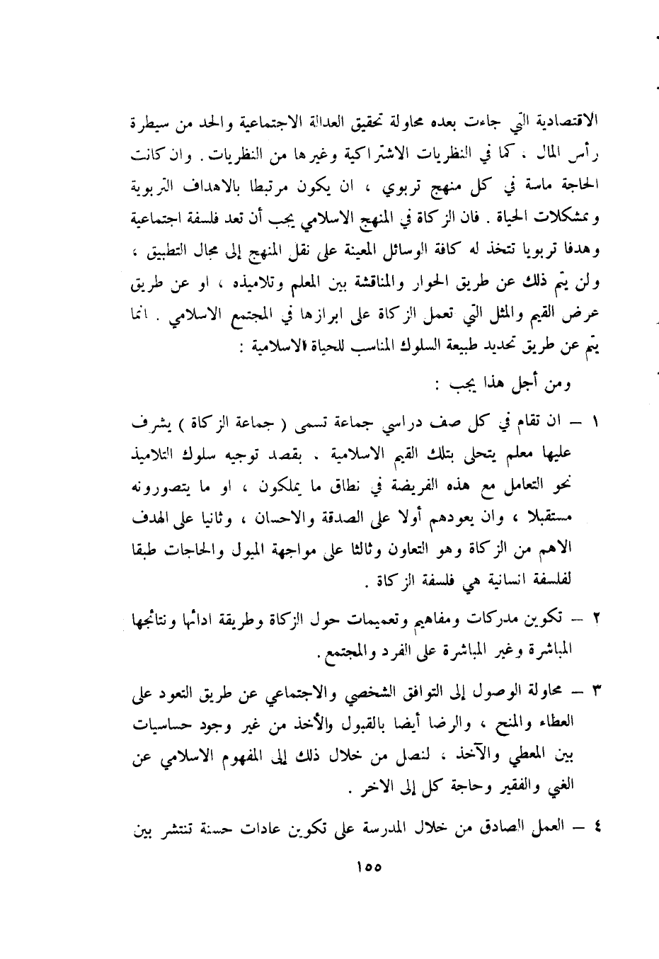 الاقتصادية التي جاءت بعده محاولة تحقيق العدالة الاجتماعية والحد من سيطرة رأس المال، كما في النظريات الاشتراكية وغيرها من النظريات. وإن كانت الحاجة ماسة في كل منهج تربوي، أن يكون مرتبطا بالأهداف التربوية وبمشكلات الحياة. فإن الزكاة في المنهج الإسلامي يجب أن تعد فلسفة اجتماعية وهدفا تربويا تتخذ له كافة الوسائل المعينة على نقل المنهج إلى مجال التطبيق، ولن يتم ذلك عن طريق الحوار والمناقشة بين المعلم وتلاميذه، أو عن طريق عرض القيم والمثل التي تعمل الزكاة على إبرازها في المجتمع الإسلامي. إنما يتم عن طريق تحديد طبيعة السلوك المناسب للحياة الإسلامية: