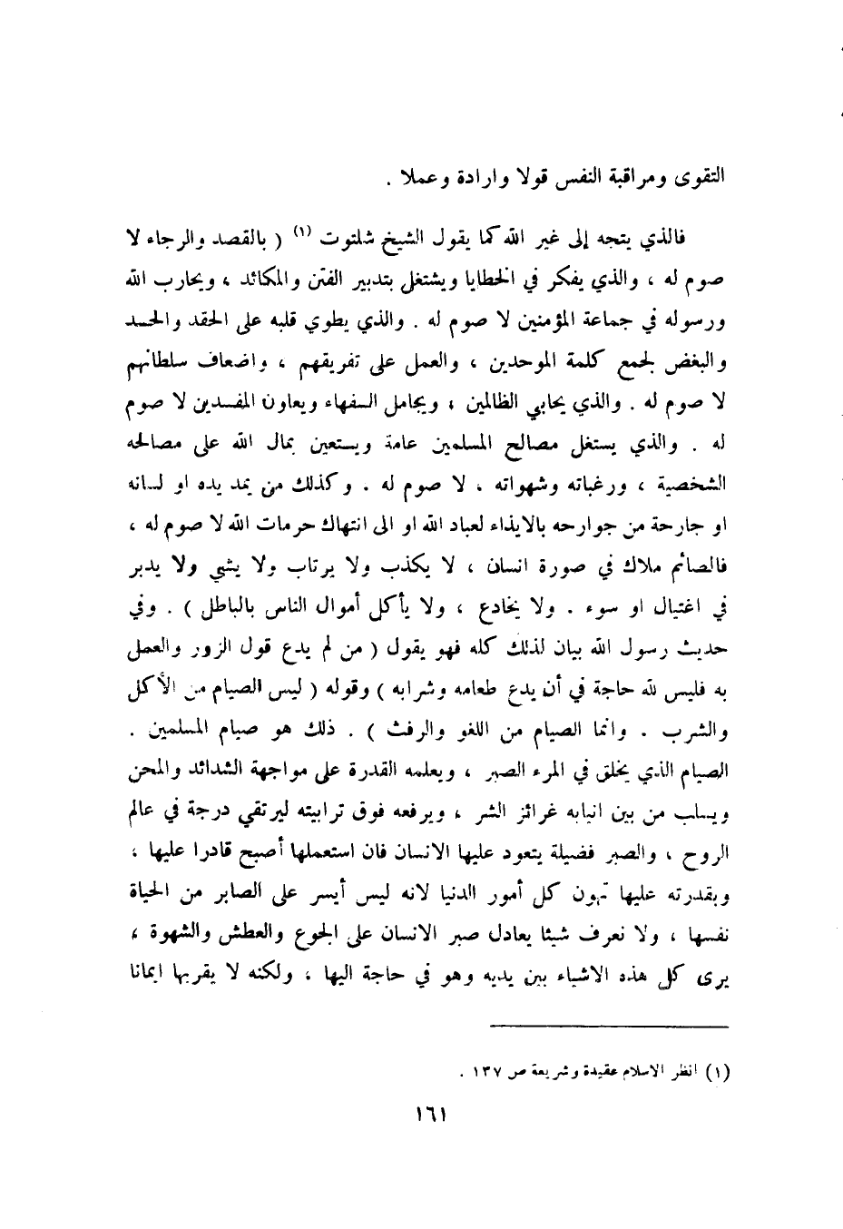 فالذي يتجه إلى غير الله كما يقول الشيخ شلتوت1: "بالقصد والرجاء لا صوم له، والذي يفكر في الخطايا ويشتغل بتدبير الفتن والمكائد، ويحارب الله ورسوله في جماعة المؤمنين لا صوم له. والذي يطوي قلبه على الحقد والحسد والبغض