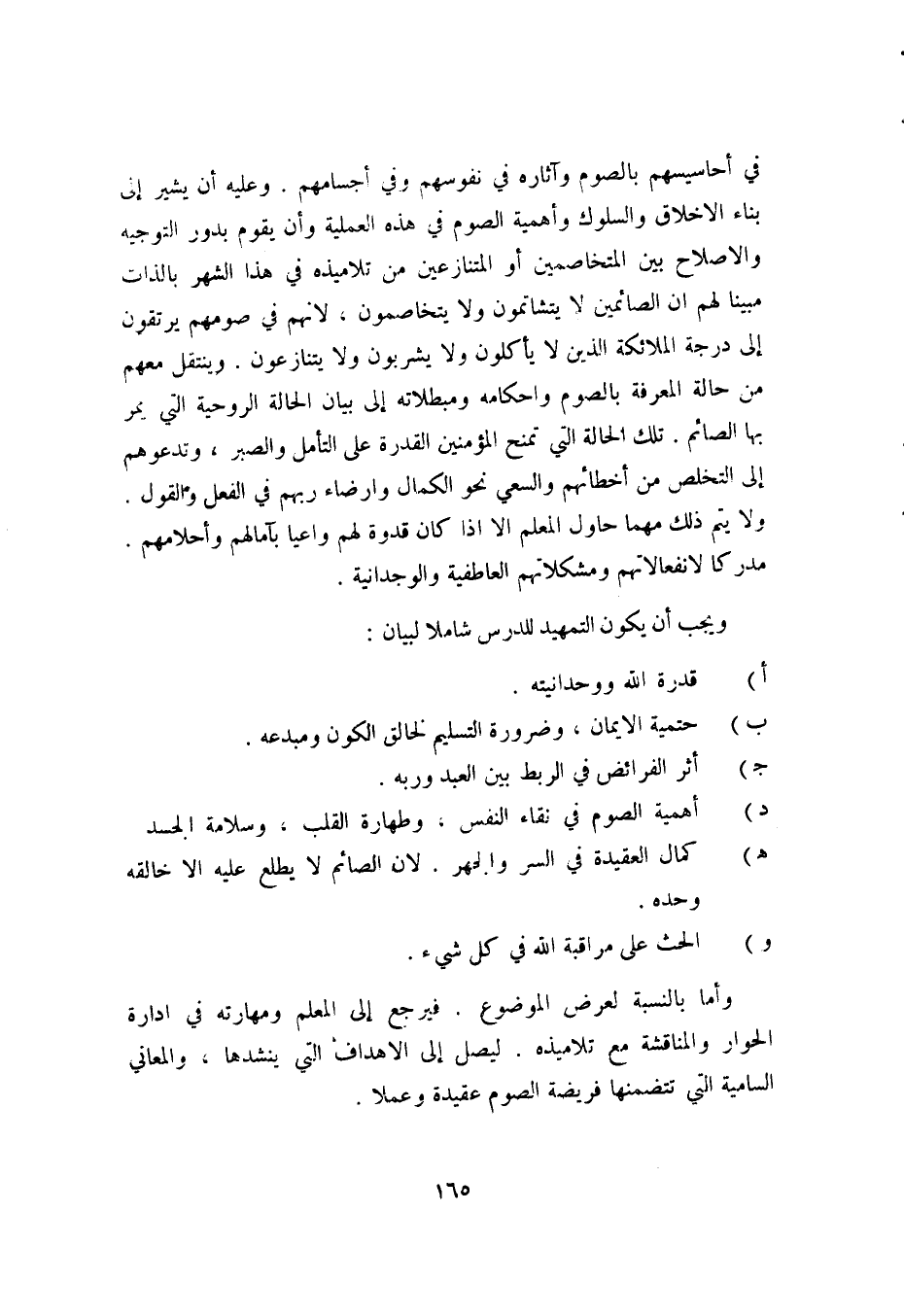 في أحاسيسهم بالصوم وآثاره في نفوسهم وفي أجسامهم. وعليه أن يشير إلى بناء الأخلاق والسلوك وأهمية الصوم في هذه العملية, وأن يقوم بدور التوجيه والإصلاح بين المتخاصمين أو المتنازعين من تلاميذه في هذا الشهر بالذات, مبينا لهم أن الصائمين لا يتشاتمون ولا يتخاصمون؛ لأنهم في صومهم يرتقون إلى درجة الملائكة الذين لا يأكلون ولا يشربون ولا يتنازعون. وينتقل معهم من حالة المعرفة بالصوم وأحكامه ومبطلاته إلى بيان الحالة الروحية التي يمر بها الصائم. تلك الحالة التي تمنح المؤمنين القدرة على التأمل والصبر، وتدعوهم إلى التخلص من أخطائهم والسعي نحو الكمال وإرضاء ربهم في الفعل والقول. ولا يتم ذلك مهما حاول المعلم إلا إذا كان قدوة لهم واعيا بآمالهم وأحلامهم. مدركا لانفعالاتهم ومشكلاتهم العاطفية والوجدانية.