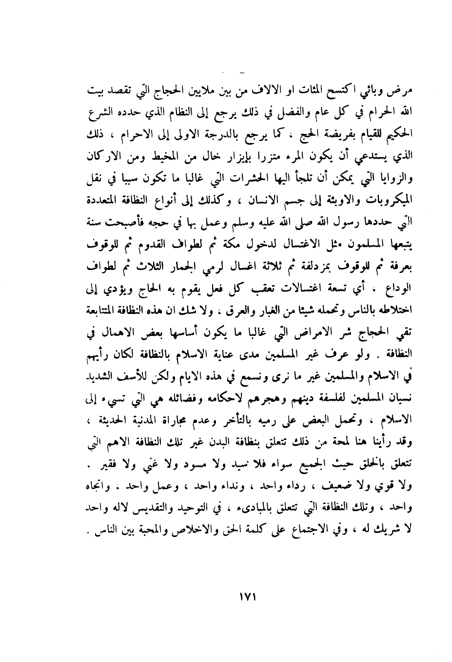مرض وبائي اكتسح المئات أو الآلاف من بين ملايين الحجاج التي تقصد بيت الله الحرام في كل عام, والفضل في ذلك يرجع إلى النظام الذي حدده الشرع الحكيم للقيام بفريضة الحج، كما يرجع بالدرجة الأولى إلى الإحرام، ذلك الذي يستدعي أن يكون المرء متزرا بإيزار خال من المخيط, ومن الأركان والزوايا التي يمكن أن تلجأ إليها الحشرات التي غالبا ما تكون سببا في نقل الميكروبات والأوبئة إلى جسم الإنسان، وكذلك إلى أنواع النظافة المتعددة التي حددها رسول الله -صلى الله عليه وسلم- وعمل بها في حجه فأصبحت سنة يتبعها المسلمون مثل الاغتسال لدخول مكة, ثم لطواف القدوم, ثم للوقوف بعرفة, ثم للوقوف بمزدلفة, ثم ثلاثة أغسال لرمي الجمار الثلاث, ثم لطواف الوداع، أي: تسعة اغتسالات تعقب كل فعل يقوم به الحاج ويؤدي إلى اختلاطه بالناس وتحمله شيئا من الغبار والعرق، ولا شك أن هذه النظافة المتتابعة تقي الحجاج شر الأمراض التي غالبا ما يكون أساسها بعض الإهمال في النظافة. ولو عرف غير المسلمين مدى عناية الإسلام بالنظافة لكان رأيهم في الإسلام والمسلمين غير ما نرى ونسمع في هذه الأيام, ولكن للأسف الشديد نسيان المسلمين لفلسفة دينهم وهجرهم لأحكامه وفضائله هي التي تسيء إلى الإسلام، وتحمل البعض على رميه بالتأخر وعدم مجاراة المدنية الحديثة، وقد رأينا هنا لمحة من ذلك تتعلق بنظافة البدن غير تلك النظافة الأهم التي تتعلق بالخلق حيث الجميع سواء فلا سيد ولا مسود ولا غني ولا فقير. ولا قوي ولا ضعيف، رداء واحد، ونداء واحد، وعمل واحد، واتجاه واحد، وتلك النظافة التي تتعلق بالمبادئ، في التوحيد والتقديس لإله واحد لا شريك له، وفي الاجتماع على كلمة الحق والإخلاص والمحبة بين الناس.