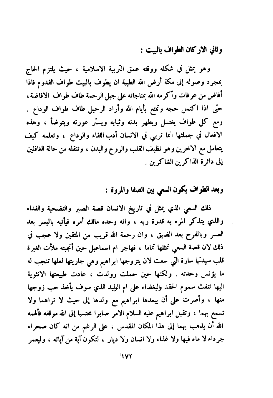 وهو يمثل في شكله ووقته عمق التربية الإسلامية، حيث يلتزم الحاج بمجرد وصوله إلى مكة إلى أرض الله الطيبة أن يطوف بالبيت طواف القدوم, فإذا أفاض من عرفات وأكرمه الله بمناجاته على جبل الرحمة طاف طواف الإفاضة، حتى إذا اكتمل حجة وتمتع بأيام الله, وأراد الرحيل طاف طواف الوداع. ومع كل طواف يغتسل ويطهر بدنه وثيابه ويستر عورته ويتوضأ، وهذه الأفعال في جملتها إنما تربي في الإنسان أدب اللقاء والوداع، وتعلمه كيف يتعامل مع الآخرين وهو نظيف القلب والروح والبدن، وتنقله من حالة الغافلين إلى دائرة الذاكرين الشاكرين.