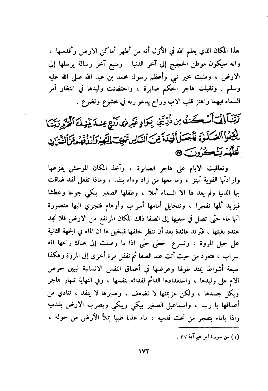 هذا المكان الذي يعلم الله في الأزل أنه من أطهر أماكن الأرض وأقدسها، وأنه سيكون موطن الحجيج إلى آخر الدنيا. ومنبع آخر رسالة يرسلها إلى الأرض، ومنبت خير نبي وأعظم رسول محمد بن عبد الله -صلى الله عليه وسلم. وتقبلت هاجر الحكم صابرة، واحتضنت وليدها في انتظار أمر السماء فيهما واهتز قلب الأب وراح يدعو ربه في خشوع وتضرع.