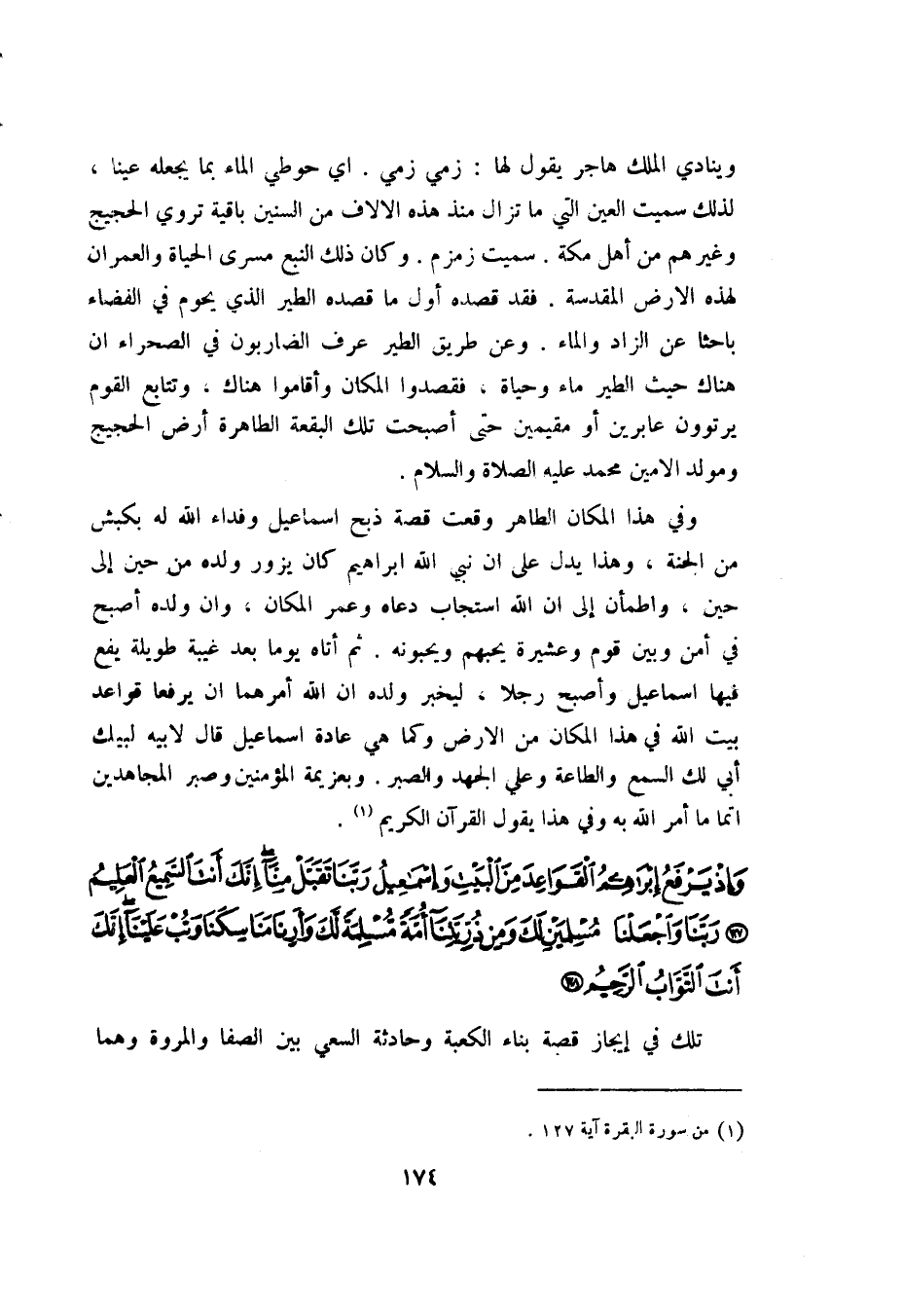 وينادي الملك هاجر يقول لها: زمي زمي. أي: حوطي الماء بما يجعله عينا، لذلك سميت العين التي ما تزال منذ هذه الآلاف من السنين باقية تروي الحجيج وغيرهم من أهل مكة. سميت زمزم. وكان ذلك النبع مسرى الحياة والعمران لهذه الأرض المقدسة. فقد قصده أول ما قصده الطير الذي يحوم في الفضاء باحثا عن الزاد والماء. وعن طريق الطير عرف الضاربون في الصحراء أن هناك حيث الطير ماء وحياة، فقصدوا المكان وأقاموا هناك، وتتابع القوم يرتوون عابرين أو مقيمين حتى أصبحت تلك البقعة الطاهرة أرض الحجيج ومولد الأمين محمد عليه الصلاة والسلام.