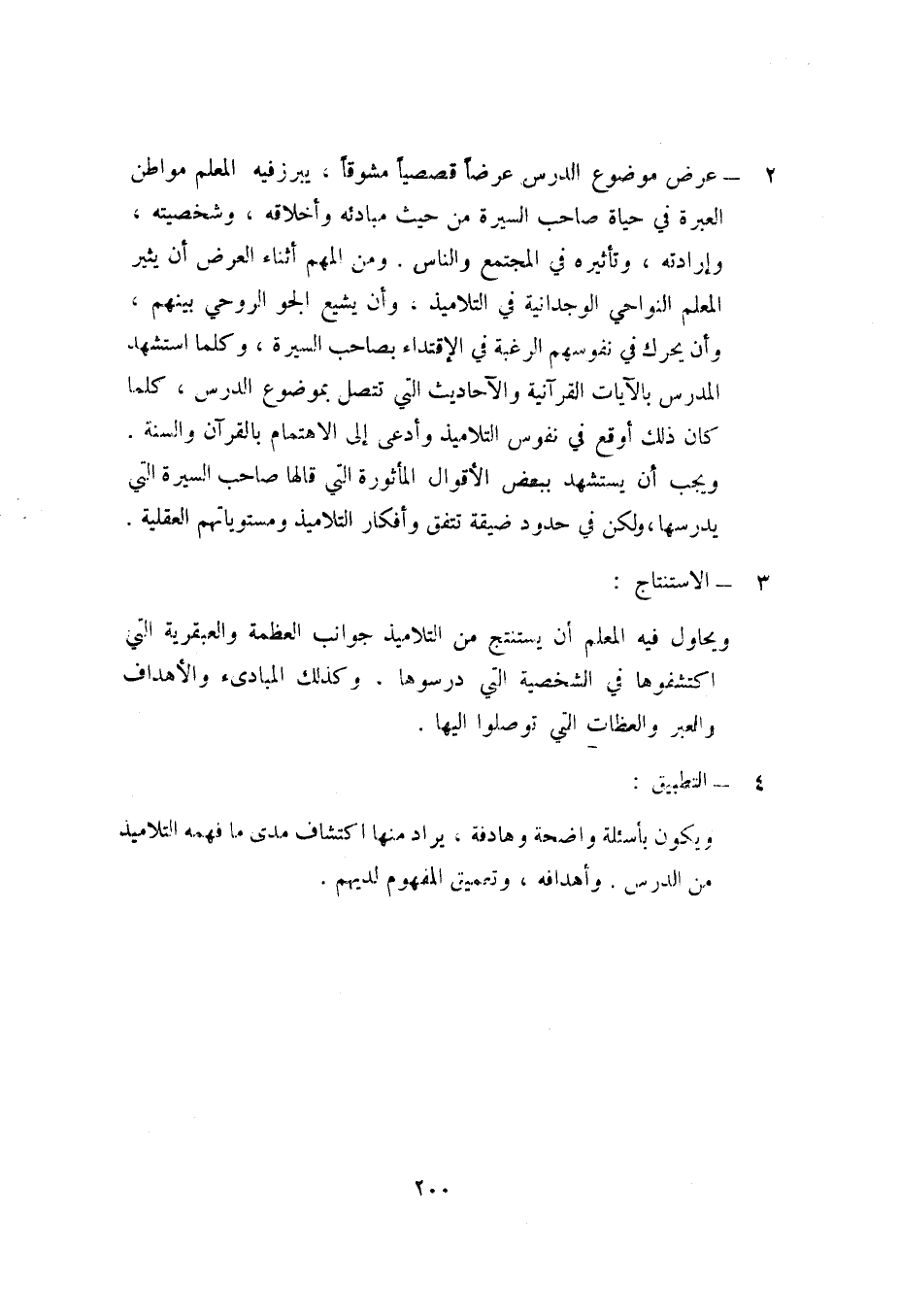 2- عرض موضوع الدرس عرضا قصصيا مشوقا، يبرز فيه المعلم مواطن العبرة في حياة صاحب السيرة من حيث مبادئه وأخلاقه، وشخصيته، وإرادته، وتأثيره في المجتمع والناس. ومن المهم أثناء العرض أن يثير المعلم النواحي الوجدانية في التلاميذ، وأن يشيع الجو الروحي بينهم، وأن يحرك في نفوسهم الرغبة في الاقتداء بصاحب السيرة، وكلما استشهد المدرس بالآيات القرآنية والآحاديث التي تتصل بموضوع الدرس، كلما كان ذلك أوقع في نفوس التلاميذ وأدعى إلى الاهتمام بالقرآن والسنة ويجب أن يستشهد ببعض الأقوال المأثورة التي قالها صاحب السيرة التي يدرسها، ولكن في حدود ضيقة تتفق وأفكار التلاميذ ومستوياتهم العقلية.