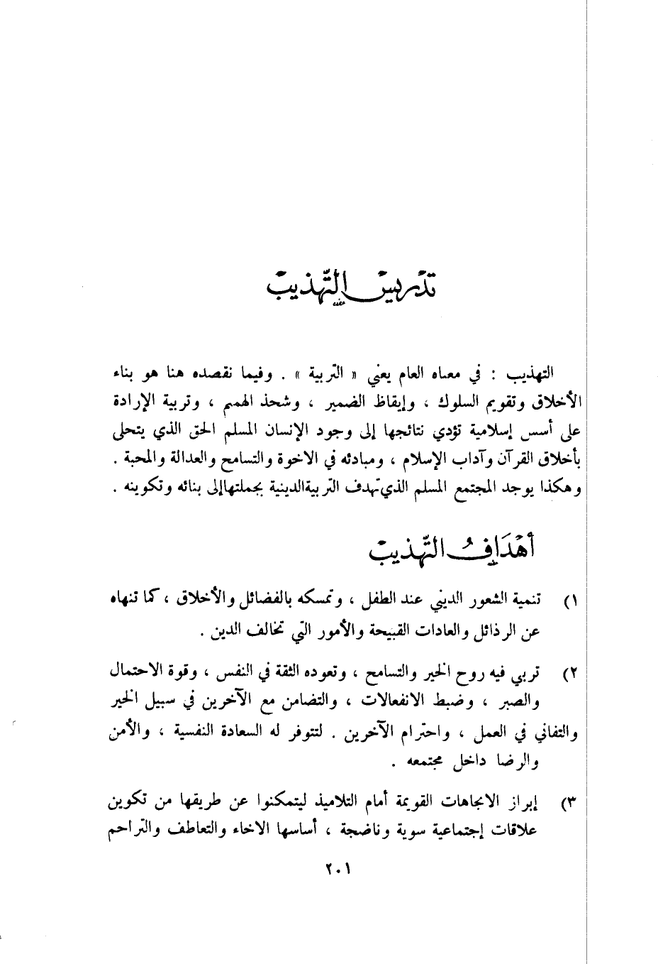 التهذيب: في معناه العام يعني "التربية" وفيما نقصده هنا هو بناء الأخلاق وتقويم السلوك، وإيقاظ الضمير، وشحذ الهمم، وتربية الإرادة على أسس إسلامية تؤدي نتائجها إلى وجود الإنسان المسلم الحق الذي يتحلى بأخلاق القرآن وآداب الإسلام، ومبادئه في الأخوة والتسامح والعدالة والمحبة. وهكذا يوجد المجتمع المسلم الذي تهدف التربية الدينية بجملتها إلى بنائه وتكوينه.