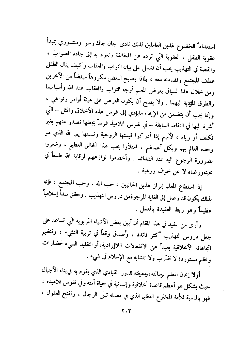 وأرى من المفيد في هذا المقام أن أبين بعض الأشياء التربوية التي تساعد على جعل دروس التهذيب أكثر فائدة، وأصدق وقعا في تربية النشء، وتنظيم اتجاهاته الأخلاقية بعيدا عن الانفعالات اللاإرادية، أو التقليد السيئ لحضارات ونظم مستوردة لا تقترب ولا تتشابه مع الإسلام في شيء.