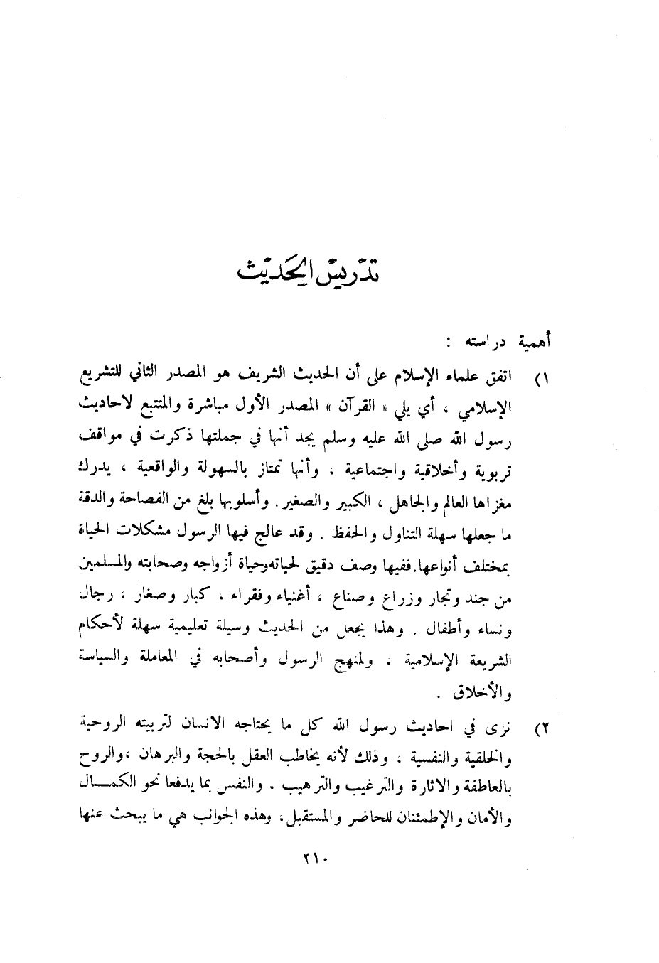 1- اتفق علماء الإسلام على أن الحديث الشريف هو المصدر الثاني للتشريع الإسلامي، أي: يلي "القرآن" المصدر الأول مباشرة, والمتتبع لأحاديث رسول الله -صلى الله عليه وسلم- يجد أنها في جملتها ذكرت في مواقف تربوية وأخلاقية واجتماعية, وأنها تمتاز بالسهولة والواقعية, يدرك مغزاها العالم والجاهل، الكبير والصغير. وأسلوبها بلغ من الفصاحة والدقة ما جعلها سهلة التناول والحفظ. وقد عالج فيها الرسول مشكلات الحياة بمختلف أنواعها. ففيها وصف دقيق لحياته وحياة أزواجه وصحابته والمسلمين من جند وتجار وزراع وصناع. أغنياء وفقراء، كبار وصغار، رجال ونساء وأطفال. وهذا يجعل من الحديث وسيلة تعليمية سهلة لأحكام الشريعة الإسلامية، ولمنهج الرسول وأصحابه في المعاملة والسياسة والأخلاق.