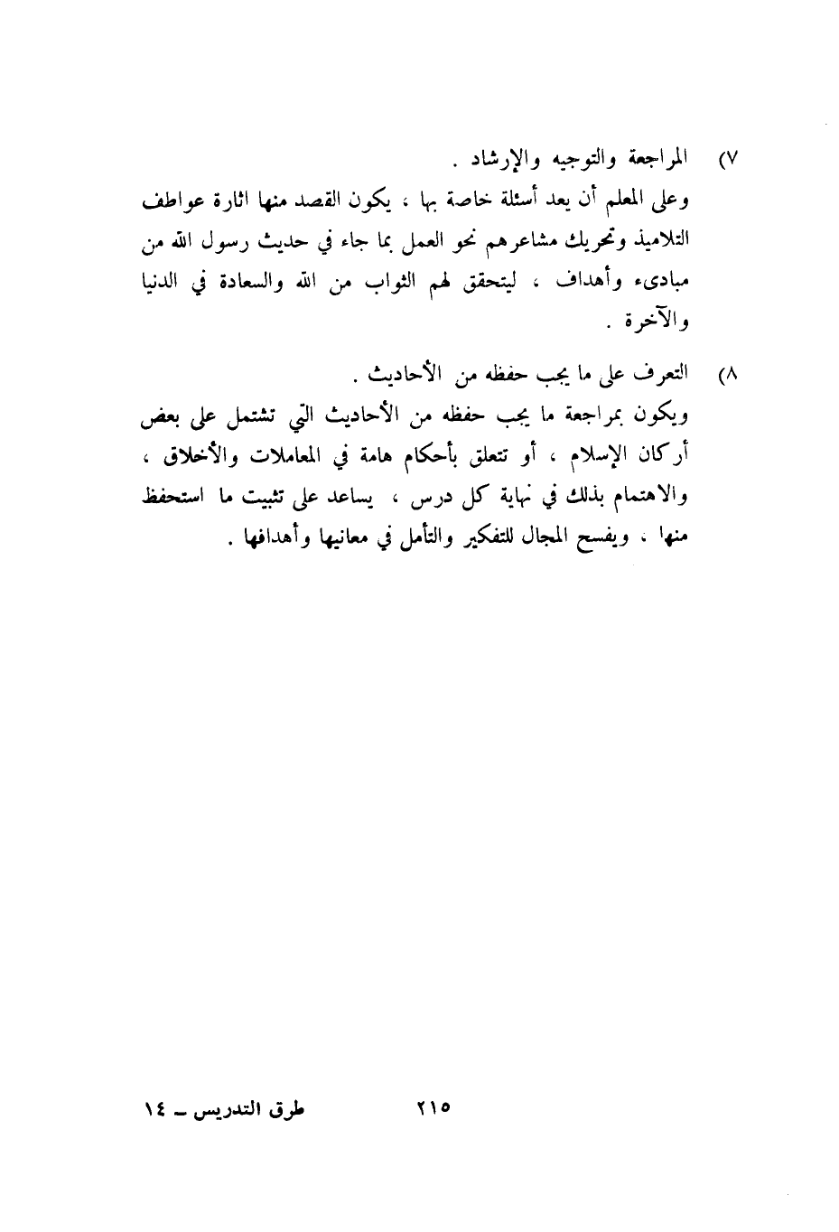 وعلى المعلم أن يعد أسئلة خاصة بها، يكون القصد منها إثارة عواطف التلاميذ وتحريك مشاعرهم نحو العمل بما جاء في حديث رسول الله من مبادئ وأهداف، ليتحقق لهم الثواب من الله والسعادة في الدنيا والآخرة.