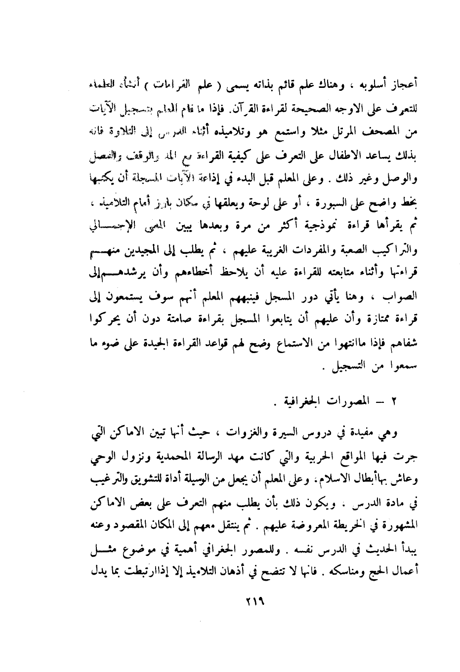 إعجاز أسلوبه، وهناك علم قائم بذاته يسمى علم "القراءات" أنشأه العلماء للتعرف على الأوجه الصحيحة لقراءة القرآن, فإذا ما قام المعلم بتسجيل الآيات من المصحف المرتل مثلا, واستمع هو وتلاميذه أثناء الدرس إلى التلاوة فإنه بذلك يساعد الأطفال على التعرف على كيفية القراءة مع المد والوقف والفصل والوصل وغير ذلك, وعلى المعلم قبل البدء في إذاعة الآيات المسجلة أن يكتبها بخط واضح على السبورة، أو على لوحة ويعلقها في مكان بارز أمام التلاميذ، ثم يقرأها قراءة نموذجية أكثر من مرة, وبعدها يبين المعنى الإجمالي والتراكيب الصعبة والمفردات الغريبة عليهم، ثم يطلب إلى المجيدين منهم قراءتها, وأثناء متابعته للقراءة عليه أن يلاحظ أخطاءهم وأن يرشدهم إلى الصواب، وهنا يأتي دور المسجل فينبههم المعلم أنهم سوف يستمعون إلى قراءة ممتازة, وأن عليهم أن يتابعوا المسجل بقراءة صامتة دون أن يحركوا شفاههم, فإذا ما انتهوا من الاستماع وضح لهم قواعد القراءة الجيدة على ضوء ما سمعوا من التسجيل.