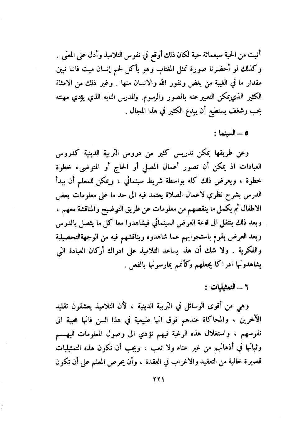 أنبت من الحبة سبعمائة حبة لكان ذلك أوقع في نفوس التلاميذ, وأدل على المعنى, وكذلك لو أحضرنا صورة تمثل المغتاب وهو يأكل لحم إنسان ميت, فإننا نبين مقدار ما في الغيبة من بغض ونفور الله والإنسان منها. وغير ذلك من الأمثلة الكثير الذي يمكن التعبير عنه بالصور والرسوم. والمدرس النابه الذي يؤدي مهنته بحب وشغف يستطيع أن يبدع الكثير في هذا المجال.