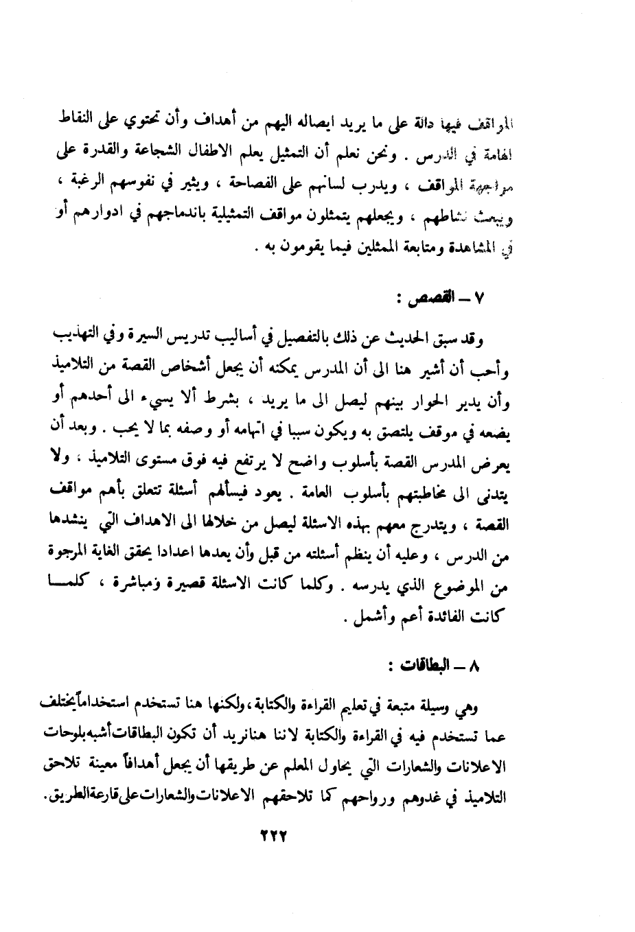 وقد سبق الحديث عن ذلك بالتفصيل في أساليب تدريس السيرة وفي التهذيب, وأحب أن أشير هنا إلى أن المدرس يمكنه أن يجعل أشخاص القصة من التلاميذ, وأن يدير الحوار بينهم ليصل إلى ما يريد، بشرط ألا يسيء إلى أحدهم أو يضعه في موقف يلتصق به, ويكون سببا في اتهامه أو وصفه بما لا يحب. وبعد أن يعرض المدرس القصة بأسلوب واضح لا يرتفع فيه فوق مستوى التلاميذ، ولا يتدنى إلى مخاطبتهم بأسلوب العامة. يعود فيسألهم أسئلة تتعلق بأهم مواقف القصة، ويتدرج معهم بهذه الأسئلة ليصل من خلالها إلى الأهداف التي ينشدها من الدرس، وعليه أن ينظم أسئلته من قبل, وأن يعدها إعدادا يحقق الغاية المرجوة من الموضوع الذي يدرسه. وكلما كانت الأسئلة قصيرة ومباشرة، كلما كانت الفائدة أعم وأشمل.