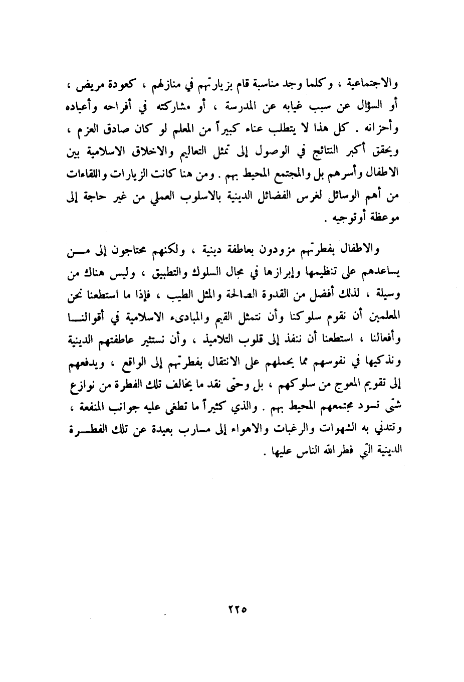والاجتماعية، وكلما وجد مناسبة قام بزيارات في منازلهم، كعوده مريض، أو السؤال عن سبب غيابه عن المدرسة، أو مشاركته في أفراحه وأعياده وأحزانه. كل هذا لا يتطلب عناء كبيرا من المعلم لو كان صادق العزم، ويحقق أكبر النتائج في الوصول إلى تمثل التعاليم والأخلاق الإسلامية بين الأطفال وأسرهم بل والمجتمع المحيط بهم. ومن هنا كانت الزيارات واللقاءات من أهم الوسائل لغرس الفضائل الدينية بالأسلوب العملي من غير حاجة إلى موعظة أو توجيه.