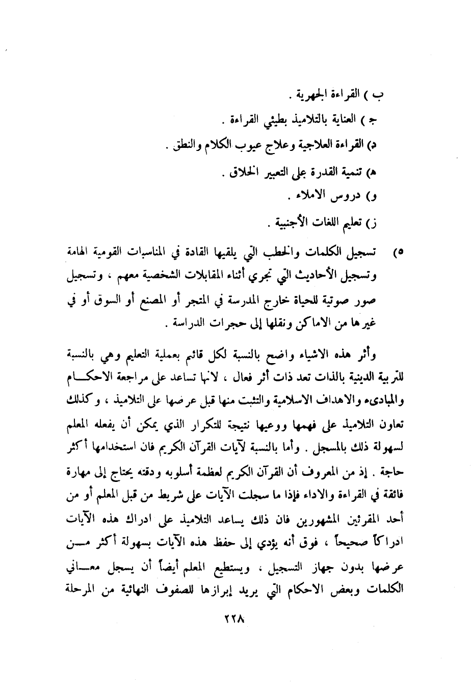 وأثر هذه الأشياء واضح بالنسبة لكل قائم بعملية التعليم, وهي بالنسبة للتربية الدينية بالذات تعد ذات أثر فعال؛ لأنها تساعد على مراجعة الأحكام والمبادئ والأهداف الإسلامية, والتثبت منها قبل عرضها على التلاميذ، وكذلك تعاون التلاميذ على فهمها ووعيها نتيجة للتكرار الذي يمكن أن يفعله المعلم لسهولة ذلك بالمسجل, وأما بالنسبة لآيات القرآن الكريم فإن استخدامها أكثر حاجة, إذ من المعروف أن القرآن الكريم لعظمة أسلوبه ودقته يحتاج إلى مهارة فائقة في القراءة والأداء, فإذا ما سجلت الآيات على شريط من قبل المعلم أو من أحد المقرئين المشهورين فإن ذلك يساعد التلاميذ على إدراك هذه الآيات إدراكا صحيحا، فوق أنه يؤدي إلى حفظ هذه الآيات بسهولة أكثر من عرضها بدون جهاز التسجيل، ويستطيع المعلم أيضا أن يسجل معاني الكلمات وبعض الأحكام التي يريد إبرازها للصفوف النهائية من المرحلة