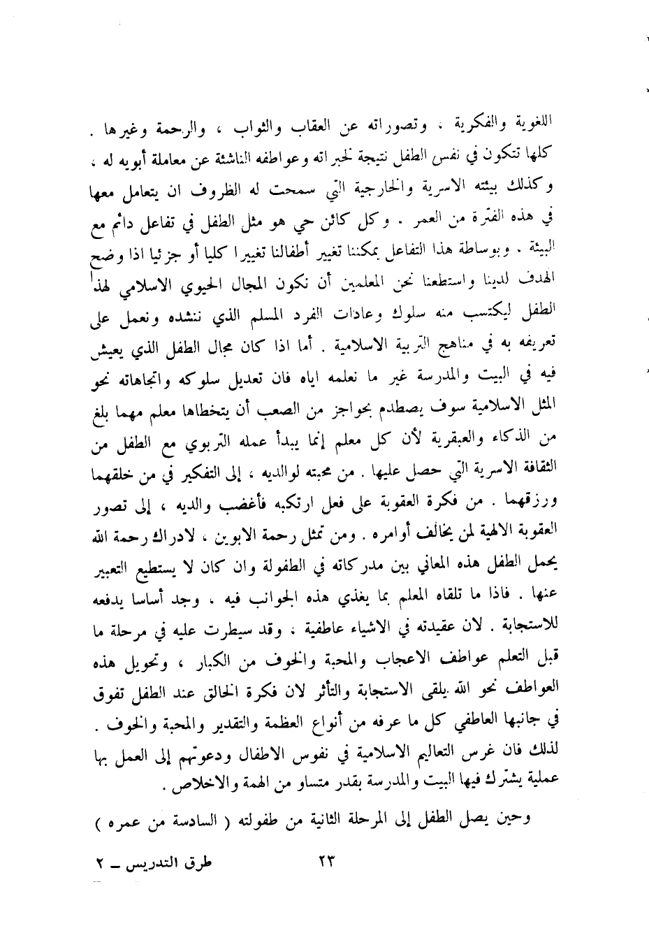 اللغوية والفكرية، وتصوراته عن العقاب والثواب، والرحمة وغيرها. كلها تتكون في نفس الطفل نتيجة لخبراته وعواطفه الناشئة عن معاملة أبوية له، وكذلك بيئته الأسرية والخارجية التي سمحت له الظروف أن يتعامل معها في هذه الفترة من العمر، وكل كائن حي هو مثل الطفل في تفاعل دائم مع البيئة وبوساطة هذا التفاعل يمكننا تغيير أطفالنا تغييرا كليا أو جزئيا, إذا وضح الهدف لدينا واستطعنا نحن المعلمين أن نكون المجال الحيوي الإسلامي لهذا الطفل؛ ليكتسب منه سلوك وعادات الفرد المسلم الذي ننشده ونعمل على تعريفه به في مناهج التربية الإسلامية، أما إذا كان مجال الطفل الذي يعيش فيه في البيت والمدرسة غير ما نعلمه إياه فإن تعديل سلوكه واتجاهاته نحو المثل الإسلامية سوف يصطدم بحواجز, من الصعب أن يتخطاها معلم مهما بلغ من الذكاء والعبقرية؛ لأن كل معلم إنما يبدأ عمله التربوي مع الطفل من الثقافة الأسرية التي حصل عليها. من محبته لوالديه، إلى التفكير في من خلقهما ورزقهما. من فكرة العقوبة على فعل ارتكبه فأغضب والديه، إلى تصور العقوبة الإلهية لمن يخالف أوامره. ومن تمثل رحمة الأبوين، لإدراك رحمة الله يحمل الطفل هذه المعاني بين مدركاته في الطفولة, وإن كان لا يستطيع التعبير عنها. فإذا ما تلقاه المعلم بما يغذي هذه الجوانب فيه، وجد أساسا يدفعه للاستجابة؛ لأنه عقيدته في الأشياء عاطفية، وقد سيطرت عليه في مرحلة ما قبل التعلم عواطف الإعجاب والمحبة والخوف من الكبار، وتحويل هذه العواطف نحو الله يلقى الاستجابة والتأثر؛ لأن فكرة الخالق عند الطفل تفوق في جانبها العاطفي كل ما عرفه من أنواع العظمة والتقدير والمحبة والخوف. لذلك فإن غرس التعاليم الإسلامية في نفوس الأطفال ودعوتهم إلى العمل بها عملية يشترك فيها البيت والمدرسة بقدر متساو من الهمة والإخلاص.