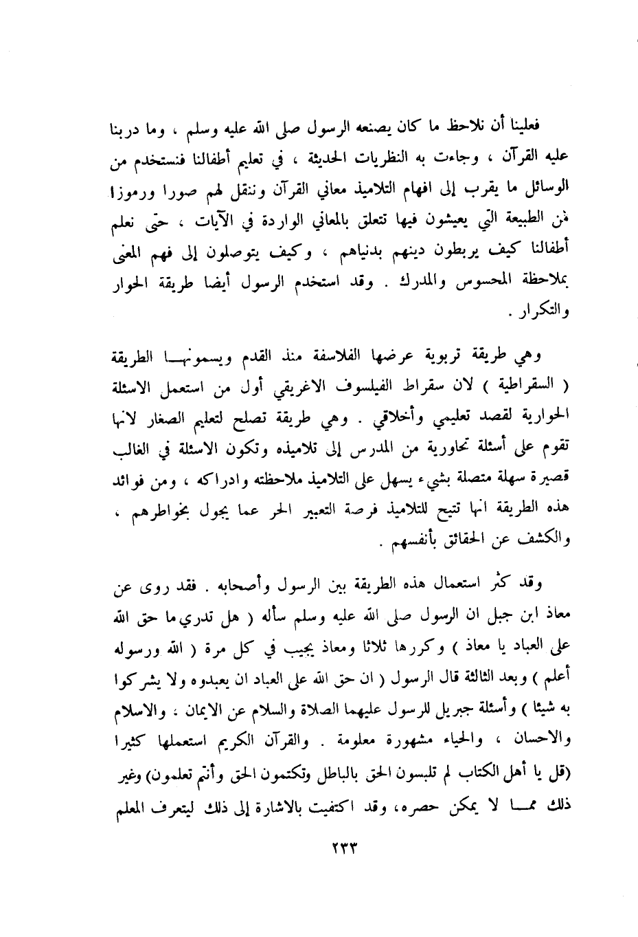 وقد كثر استعمال هذه الطريقة بين الرسول وأصحابه. فقد روي عن معاذ بن جبل أن الرسول -صلى الله عليه وسلم- سأله "هل تدري ما حق الله على العباد يا معاذ" وكررها ثلاثا ومعاذ يجيب في كل مرة "الله ورسوله أعلم" وبعد الثالثة, قال الرسول: "إن حق الله على العباد أن يعبدوه ولا يشركوا به شيئا" وأسئلة جبريل للرسول عليهما الصلاة والسلام عن الإيمان، والإسلام والإحسان، والحياء مشهورة معلومة, والقرآن الكريم استعملها كثيرا {يَا أَهْلَ الْكِتَابِ لِمَ تَلْبِسُونَ الْحَقَّ بِالْبَاطِلِ وَتَكْتُمُونَ الْحَقَّ وَأَنْتُمْ تَعْلَمُونَ} وغير ذلك مما لا يمكن حصره، وقد اكتفيت بالإشارة إلى ذلك ليتعرف المعلم