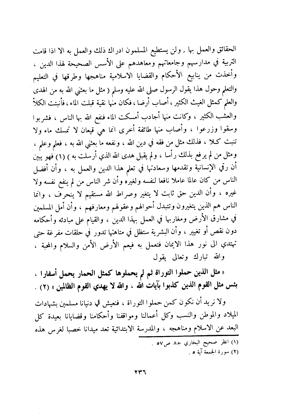 الحقائق والعمل بها، ولن يستطيع المسلمون إدراك ذلك والعمل به إلا إذا قامت التربية في مدارسهم وجامعاتهم ومعاهدهم على الأسس الصحيحة لهذا الدين، وأخذت من ينابيع الأحكام والقضايا الإسلامية مناهجها وطرقها في التعليم والتعلم, وحول هذا يقول الرسول -صلى الله عليه وسلم: "مثل ما بعثني الله به من الهدى والعلم كمثل الغيث الكثير، أصاب أرضا، فكان منها نقية قبلت الماء، فأنبتت الكلأ والعشب الكثير، وكانت منها أجادب أمسكت الماء فنفع الله بها الناس، فشربوا وسقوا وزرعوا، وأصاب منها طائفة أخرى إنما هي قيعان لا تمسك ماء ولا تنبت كلأ، فذلك مثل من فقه في دين الله، ونفعه ما بعثني الله به، فعلم وعلم، ومثل من لم يرفع بذلك رأسا، ولم يقبل هدى الله الذي أرسلت به" 1 فهو يبين أن رقي الإنسانية وتقدمها وسعادتها في تعلم هذا الدين والعمل به، وأن أفضل الناس من كان عالما عاملا نافعا لنفسه ولغيره, وأن شر الناس من لم ينفع نفسه ولا غيره، وأن الدين حق ثابت لا يتغير وصراط الله مستقيم لا ينحرف، وإنما الناس هم الذين يتغيرون وتتبدل أحوالهم وعقولهم ومعارفهم، وأن أمل المسلمين في مشارق الأرض ومغاربها في العمل بهذا الدين، والقيام على مبادئه وأحكامه دون نقص أو تغيير، وأن البشرية ستظل في متاهتها تدور في حلقات مفرغة حتى تهتدي إلى نور هذا الإيمان, فتعمل به فيعم الأرض الأمن والسلام والمحبة، والله تبارك وتعالى يقول: