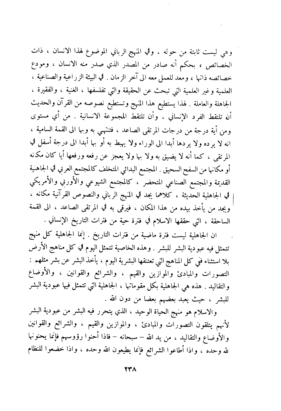 وهي ليست ثابتة من حوله، وفي المنهج الرباني الموضوع لهذا الإنسان ذات الخصائص، بحكم أنه صادر من المصدر الذي صدر منه الإنسان، ومودع خصائصه ذاتها، ومعد للعمل معه إلى آخر الزمان, في البيئة الزراعية والصناعية، العلمية وغير العلمية التي تبحث عن الحقيقة والتي تفلسفها، الغنية والفقيرة، الجاهلة والعاملة, لهذا يستطيع هذا المنهج وتستطيع نصوصه من القرآن والحديث أن تلتقط الفرد الإنساني، وأن تلتقط المجموعة الإنسانية من أي مستوى ومن أية درجة من درجات المرتقى الصاعد، فتنتهى به وبها إلى القمة السامية، أنه لا يرده ولا يردها أبدا إلى الوراء ولا يهبط به أو بها أبدا إلى درجة أسفل في المرتقى، كما أنه لا يضيق به ولا بها ولا يعجز عن رفعه ورفعها أيا كان مكانه أو مكانها من السفح السحيق. المجتمع البدائي المتخلف كالمجتمع العربي في الجاهلية القديمة والمجتمع الصناعي المتحضر، كالمجتمع الشيوعي والأوروبي والأمريكي في الجاهلية الحديثة، كلاهما يجد في المنهج الرباني والنصوص القرآنية مكانه، ويجد من يأخذ بيده من هذا المكان، فيرقى به في المرتقى الصاعد، إلى القمة الساحقة، التي حققها الإسلام في فترة حية من فترات التاريخ الإنساني.