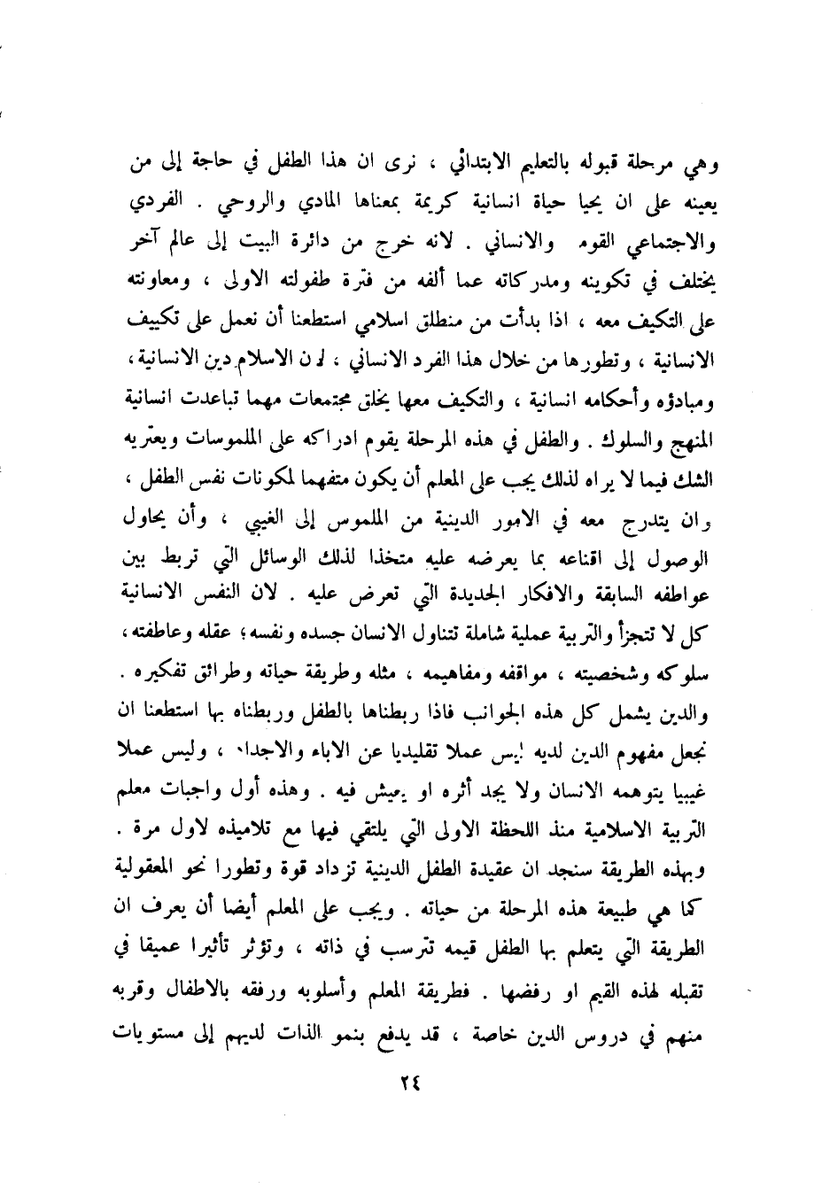وهي مرحلة قبوله بالتعليم الابتدائي، نرى أن هذا الطفل في حاجة إلى من يعينه على أن يحيا حياة إنسانية كريمة بمعناها المادي والروحي, الفردي والاجتماعي القومي والإنساني؛ لأنه خرج من دائرة البيت إلى عالم آخر يختلف في تكوينه ومدركاته عما ألفه من فترة طفولته الأولى، ومعاونته على التكيف معه، إذا بدأت من منطلق إسلامي استطعنا أن نعمل على تكييف الإنسانية، وتطورها من خلال هذا الفرد الإنساني، إن الإسلام دين الإنسانية، ومبادؤه وأحكامه إنسانية، والتكيف معها يخلق مجتمعات مهما تباعدت إنسانية المنهج والسلوك, والطفل في هذه المرحلة يقوم إدراكه على الملموسات ويعتريه الشك فيما لا يراه لذلك يجب على المعلم أن يكون متفهما لمكونات نفس الطفل، وأن يتدرج معه في الأمور الدينية من الملموس إلى الغيبي، وأن يحاول الوصول إلى إقناعه بما يعرضه عليه متخذا لذلك الوسائل التي تربط بين عواطفه السابقة والأفكار الجديدة التي تعرض عليه؛ لأن النفس الإنسانية كل لا تتجزأ والتربية عملية شاملة تتناول الإنسان جسده ونفسه، عقله وعاطفته، سلوكه وشخصيته، مواقفه ومفاهيمه، مثله وطريقة حياته وطرائق تفكيره.
