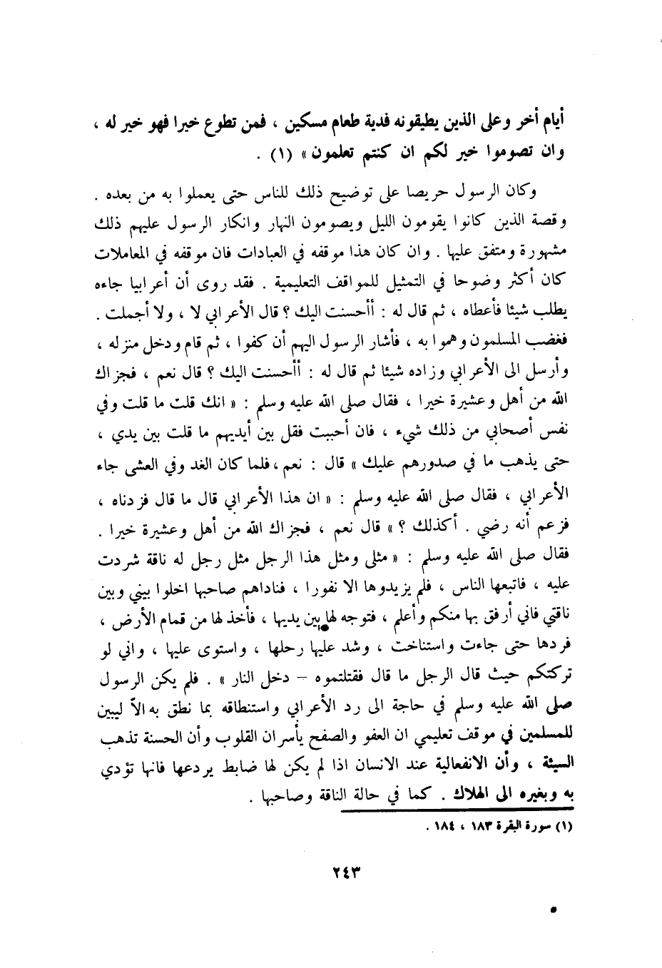 وكان الرسول حريصا على توضيح ذلك للناس حتى يعملوا به من بعده, وقصة الذين كانوا يقومون الليل ويصومون النهار وإنكار الرسول عليهم ذلك مشهورة ومتفق عليها, وإن كان هذا موقفه في العبادات فإن موقفه في المعاملات كان أكثر وضوحا في التمثيل للمواقف التعليمية, فقد روي أن أعرابيا جاءه يطلب شيئا فأعطاه، ثم قال له: "أأحسنت إليك؟ " , قال الأعرابي: لا، ولا أجملت. فغضب المسلمون وهموا به، فأشار الرسول إليهم أن كفوا، ثم قام ودخل منزله، وأرسل إلى الأعرابي وزاده شيئا ثم قال له: "أأحسنت إليك؟ " , قال: نعم، فجزاك الله من أهل وعشيرة خيرا، فقال -صلى الله عليه وسلم: "إنك قلت ما قلت وفي نفس أصحابي من ذلك شيء، فإن أحببت فقل بين أيديهم ما قلت بين يدي، حتى يذهب ما في صدورهم عليك" قال: نعم، فلما كان الغد وفي العشي جاء الأعرابي، فقال -صلى الله عليه وسلم: "إن هذا الأعرابي قال ما قال فزدناه، فزعم أنه رضي أكذلك؟ " قال: نعم، فجزاك الله من أهل وعشيرة خيرا. فقال -صلى الله عليه وسلم: "مثلي ومثل هذا الرجل مثل رجل له ناقة شردت عليه، فاتبعها الناس، فلم يزيدوها إلا نفورا، فناداهم صاحبها أخلوا بيني وبين ناقتي, فإني أرفق بها منكم وأعلم، فتوجه لها بين يديها، فأخذها من قمام الأرض، فردها حتى جاءت واستناخت، وشد عليها رحلها، واستوى عليها، وإني لو تركتكم حيث قال الرجل ما قال فقتلتموه دخل النار". فلم يكن الرسول -صلى الله عليه وسلم- في حاجة إلى رد الأعرابي واستنطاقه بما نطق به, إلا ليبين للمسلمين في موقف تعليمي أن العفو والصفح يأسران القلوب, وأن الحسنة تذهب السيئة، وأن الانفعالية عند الإنسان إذا لم يكن لها ضابط يردعها فإنها تؤدي به وبغيره إلى الهلاك. كما في حالة الناقة وصاحبها.