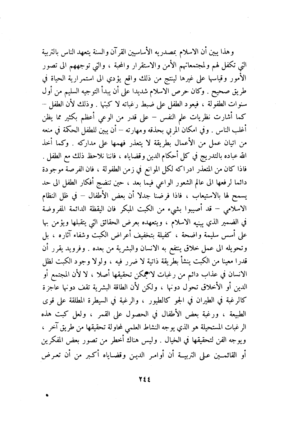 وهذا يبين أن الإسلام بمصدريه الأساسيين: القرآن والسنة يتعهد الناس بالتربية التي تكفل لهم ولمجتمعاتهم الأمن والاستقرار والمحبة، والتي توجههم إلى تصور الأمور وقياسها على غيرها لينتج من ذلك واقع يؤدي إلى استمرارية الحياة في طريق صحيح, وكان حرص الإسلام شديدا على أن يبدأ التوجيه السليم من أول سنوات الطفولة، فيعود الطفل على ضبط رغباته لا كبتها؛ وذلك لأن الطفل كما أشارت نظريات علم النفس على قدر من الوعي أعظم بكثير مما يظن أغلب الناس. وفي إمكان المربي بحذقه ومهارته أن يبين للطفل الحكمة في منعه من إتيان عمل من الأعمال بطريقة لا يتعذر فهمها على مداركه، وكما أخذ الله عباده بالتدريج في كل أحكام الدين وقضاياه، فإننا نلاحظ ذلك مع الطفل, فإذا كان من المتعذر إدراكه لكل الموانع في زمن الطفولة، فإن الفرصة موجودة دائما لرفعها إلى عالم الشعور الواعي فيما بعد، حين تنضج أفكار الطفل إلى حد يسمح لها بالاستيعاب، فإذا فرضنا جدلا أن بعض الأطفال -في ظل النظام الإسلامي- قد أصيبوا بشيء من الكبت المبكر فإن اليقظة الدائمة المفروضة في الضمير الذي يبنيه الإسلام، ويتعهده بعرض الحقائق التي يتقبلها ويؤمن بها على أسس سليمة واضحة، كفيلة بتخفيف أعراض الكبت وشفاء آثاره، بل وتحويله إلى عمل خلاق ينتفع به الإنسان والبشرية من بعده, وفرويد يقرر أن قدرا معينا من الكبت ينشأ بطريقة ذاتية لا ضرر فيه، ولولا وجود الكبت لظل الإنسان في عذاب دائم من رغبات لا يمكن تحقيقها أصلا، لا لأن المجتمع أو الدين أو الأخلاق تحول دونها؛ ولكن لأن الطاقة البشرية تقف دونها عاجزة كالرغبة في الطيران في الجو كالطيور، والرغبة في السيطرة المطلقة على قوى الطبيعة، ورغبة بعض الأطفال في الحصول على القمر، ولعل كبت هذه الرغبات المستحيلة هو الذي يوجه النشاط العلمي لمحاولة تحقيقها من طريق آخر، ويوجه الفن لتحقيقها في الخيال, وليس هناك أخطر من تصور بعض المفكرين أو القائمين على التربية أن أوامر الدين وقضاياه أكبر من أن تعرض