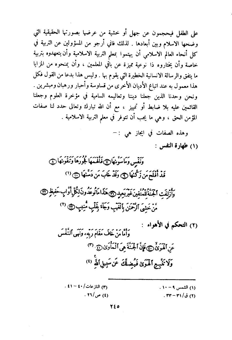 على الطفل فيحجمون عن جهل أو خشية من عرضها بصورتها الحقيقية التي وضحها الإسلام وبين أبعادها؛ لذلك فإني أرجو من المسئولين عن التربية في كل أنحاء العالم الإسلامي أن يهتموا بمعلم التربية الإسلامية, وأن يتعهدوه بتربية خاصة, وأن يختاروه ذا نوعية مميزة عن باقي المعلمين، وأن يمنحوه من المزايا ما يتفق والرسالة الإنسانية الخطيرة التي يقوم بها, وليس هذا بدعا من القول فكل هذا معمول به عند أتباع الأديان الأخرى من قساوسة وأحبار ورهبان ومبشرين, ونحن وحدنا الذين جعلنا ديننا وتعاليمه السامية في مؤخرة العلوم, وجعلنا القائمين عليه بلا ضابط أو تمييز، مع أن الله تبارك وتعالى حدد لنا صفات المؤمن الحق، وهي ما يجب أن تتوفر في معلم التربية الإسلامية.