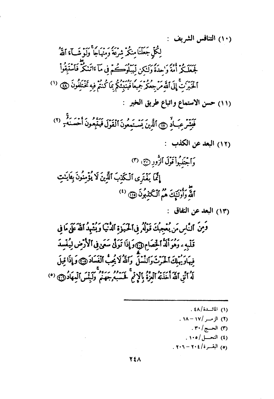 10- التنافس الشريف: {لِكُلٍّ جَعَلْنَا مِنْكُمْ شِرْعَةً وَمِنْهَاجًا وَلَوْ شَاءَ اللَّهُ لَجَعَلَكُمْ أُمَّةً وَاحِدَةً وَلَكِنْ لِيَبْلُوَكُمْ فِي مَا آتَاكُمْ فَاسْتَبِقُوا الْخَيْرَاتِ إِلَى اللَّهِ مَرْجِعُكُمْ جَمِيعًا فَيُنَبِّئُكُمْ بِمَا كُنْتُمْ فِيهِ تَخْتَلِفُونَ} 1