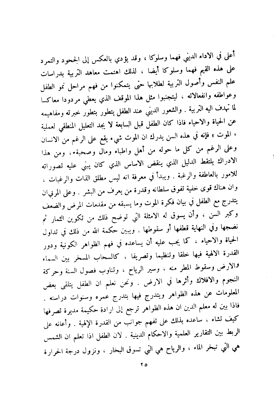 أعلى في الأداء الديني فهما وسلوكان وقد يؤدي بالعكس إلى الجحود والتمرد على هذه القيم فهما وسلوكا أيضا، لذلك اهتمت معاهد التربية بدراسات علم النفس وأصول التربية لطلابها حتى يتمكنوا من فهم مراحل نمو الطفل وعواطفه وانفعالاته، ليتجنبوا مثل هذا الموقف الذي يعطي مردودا معاكسا لما تهدف إليه التربية، والشعور الديني عند الطفل يتطور بتطور خبرته ومفاهيمه عن الحياة والأحياء فإذا كان الطفل قبل السابعة لا يجد التعليل المنطقي لعملية "الموت" فإنه في هذه السن يدرك أن الموت شيء يقع على الرغم من الإنسان وعلى الرغم من كل ما حوله من أهل وأطباء ومال وصحبة، ومن هذا الإدراك يلتقط الدليل الذي ينقض الأساس الذي كان يبني عليه تصوراته للأمور بالعاطفة والرغبة. ويبدأ في معرفة أنه ليس مطلق الذات والرغبات، وأن هناك قوى خفية تفوق سلطانه وقدرة من يعرف من البشر. وعلى المربي أن يتدرج مع الطفل في بيان فكرة الموت وما يسبقه من مقدمات المرض والضعف وكبر السن، وأن يسوق له الأمثلة التي توضح ذلك من تكوين الثمار ثم نضجها وفي النهاية قطفها أو سقوطها. ويبين حكمة الله من ذلك في تداول الحياة والأحياء، كما يجب عليه أن يساعده في فهم الظواهر الكونية ودور القدرة الإلهية فيها خلقا وتنظيما وتصريفا، كالسحاب المسخر بين السماء والأرض وسقوط المطر منه، وسير الرياح، وتناوب فصول السنة وحركة النجوم والأفلاك وأثرها في الأرض، ونحن نعلم أن الطفل يتلقى بعض المعلومات عن هذه الظواهر ويتدرج فيها بتدرج عمره وسنوات دراسته. فإذا بين له معلم الدين أن هذه الظواهر ترجع إلى إرادة حكيمة مديرة تصرفها كيف تشاء، ساعده بذلك على تفهم جوانب من القدرة الإلهية، وأعانه على الربط بين التقارير العلمية والأحكام الدينية؛ لأن الطفل إذا تعلم أن الشمس هي التي تبخر الماء، والرياح هي التي تسوق البخار، ونزول درجة الحرارة