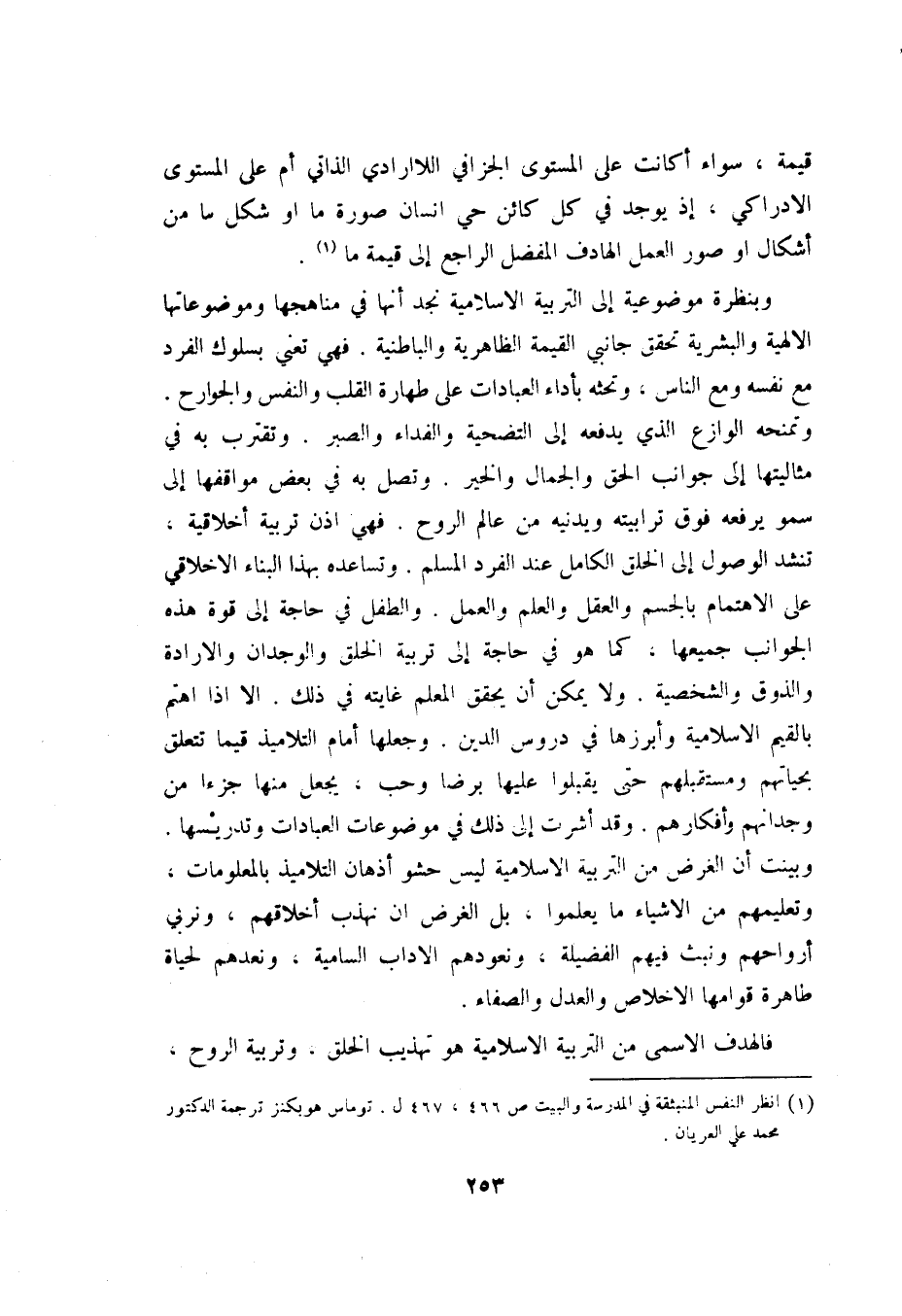 وبنظرة موضوعية إلى التربية الإسلامية نجد أنها في مناهجها وموضوعاتها الإلهية والبشرية تحقق جانبي القيمة الظاهرية والباطنية, فهي تعنى بسلوك الفرد مع نفسه ومع الناس، وتحثه بأداء العبادات على طهارة القلب والنفس والجوارح, وتمنحه الوازع الذي يدفعه إلى التضحية والفداء والصبر. وتقترب به في مثاليتها إلى جوانب الحق والجمال والخير, وتصل به في بعض مواقفها إلى سمو يرفعه فوق ترابيته ويدنيه من عالم الروح, فهي إذن تربية أخلاقية، تنشد الوصول إلى الخلق الكامل عند الفرد المسلم, وتساعده بهذا البناء الأخلاقي على الاهتمام بالجسم والعقل والعلم والعمل, والطفل في حاجة إلى قوة هذه الجوانب جميعها، كما هو في حاجة إلى تربية الخلق والوجدان والإرادة والذوق والشخصية. ولا يمكن أن يحقق المعلم غايته في ذلك, إلا إذا اهتم بالقيم الإسلامية وأبرزها في دروس الدين. وجعلها أمام التلاميذ قيما تتعلق بحياتهم ومستقبلهم حتى يقبلوا عليها برضا وحب، يجعل منها جزءا من وجدانهم وأفكارهم, وقد أشرت إلى ذلك في موضوعات العبادات وتدريسها, وبينت أن الغرض من التربية الإسلامية ليس حشو أذهان التلاميذ بالمعلومات، وتعليمهم من الأشياء ما يعلموا، بل الغرض أن نهذب أخلاقهم، ونربي أرواحهم ونبث فيهم الفضيلة، ونعودهم الآداب السامية، ونعدهم لحياة طاهرة قوامها الإخلاص والعدل والصفاء.