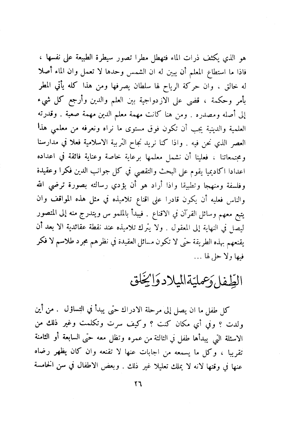 هو الذي يكثف ذرات الماء فتهطل مطرا تصور سيطرة الطبيعة على نفسها، فإذا ما استطاع المعلم أن يبين له أن الشمس وحدها لا تعمل وأن الماء أصلا له خالق، وأن حركة الرياح لها سلطان يصرفها, ومن هذا كله يأتي المطر بأمر وحكمة، قضى على الازدواجية بين العلم والدين وأرجع كل شيء إلى أصله ومصدره. ومن هنا كانت مهمة معلم الدين مهمة صعبة. وقدرته العلمية والدينية يجب أن تكون فوق مستوى ما نراه ونعرفه من معلمي هذا العصر الذي نحن فيه. وإذا كنا نريد نجاح التربية الإسلامية فعلا في مدارسنا ومجتمعاتنا، فعلينا أن نشمل معلمها برعاية خاصة وعناية فائقة في إعداده إعدادا إكاديميا يقوم على البحث والتقصي في كل جوانب الدين, فكرا وعقيدة وفلسفة ومنهجا وتطبيقا, واذا أراد هو أن يؤدي رسالته بصورة ترضي الله والناس فعليه أن يكون قادرا على إقناع تلاميذه في مثل هذه المواقف, وأن يتبع معهم وسائل القرآن في الإقناع. فيبدأ بالملموس ويتدرج منه إلى المتصور ليصل في النهاية إلى المعقول. ولا يترك تلاميذه عند نقطة عقائدية إلا بعد أن يقنعهم بهذه الطريقة حتى لا تكون مسائل العقيدة في نظرهم مجرد طلاسم لا فكر فيها ولا حل لها ...
