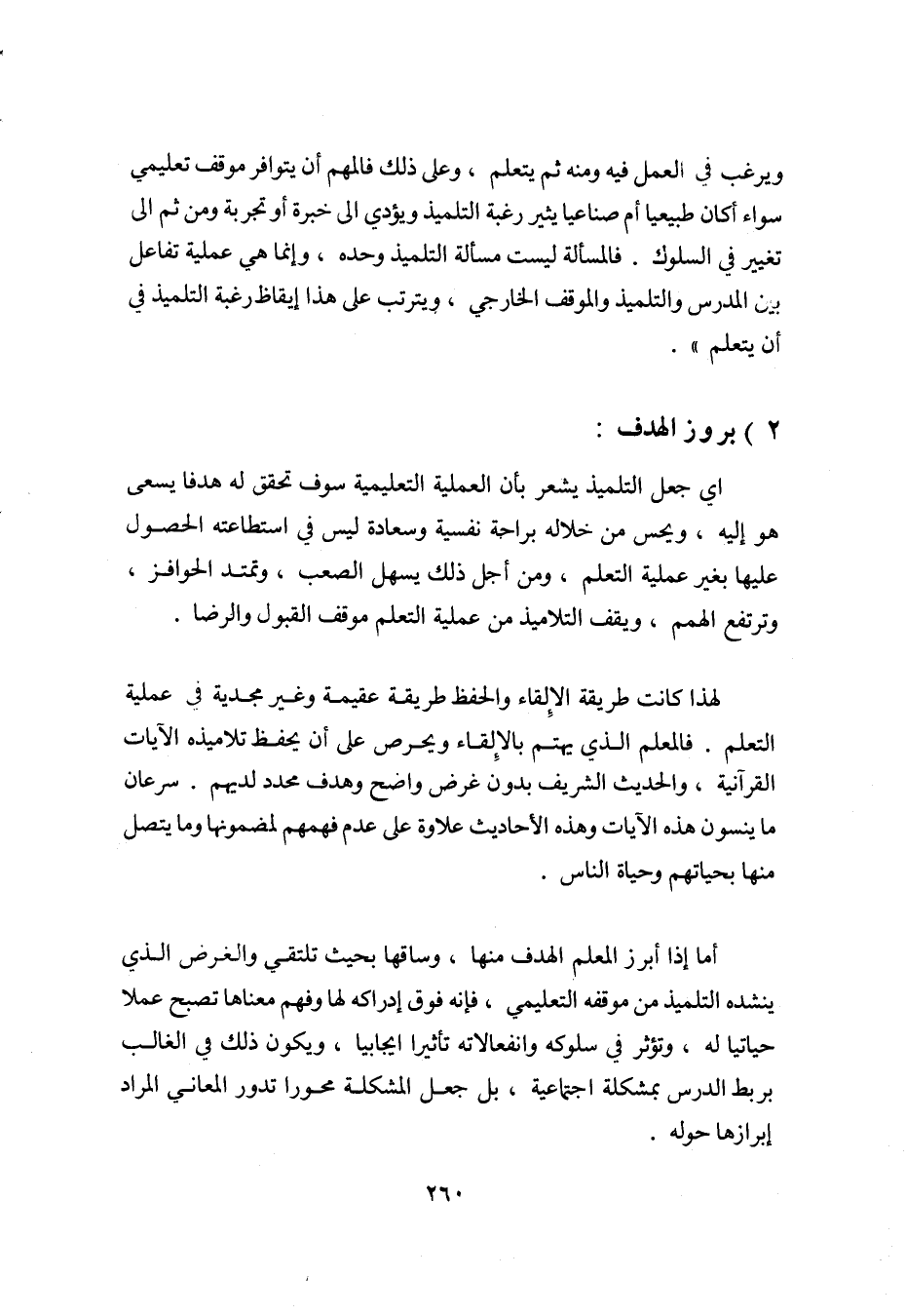 أي: جعل التلميذ يشعر بأن العملية التعليمية سوف تحقق له هدفا يسعى هو إليه، ويحس من خلاله براحة نفسية وسعادة ليس في استطاعته الحصول عليها بغير عملية التعلم، ومن أجل ذلك يسهل الصعب، وتمتد الحوافز، وترتفع الهمم، ويقف التلاميذ من عملية التعلم موقف القبول والرضا.
