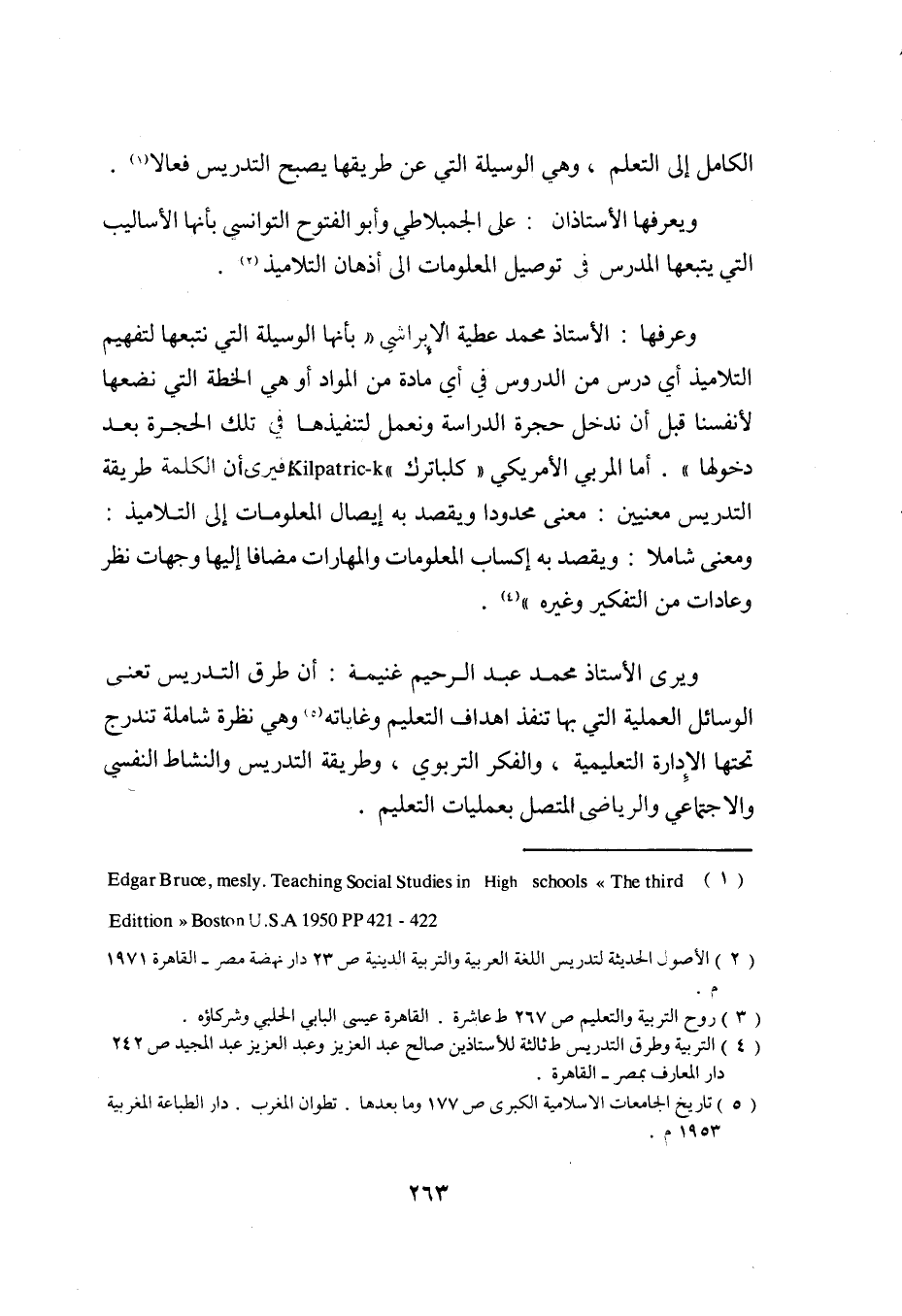 وعرفها: الأستاذ محمد عطية الإبراشي "بأنها الوسيلة التي نتبعها لتفهيم التلاميذ أي درس من الدروس في أي مادة من المواد, أو هي الخطة التي نضعها لأنفسنا قبل أن ندخل حجرة الدراسة ونعمل لتنفيذها في تلك الحجرة بعد دخولها"3 أما المربي الأمريكي "كلباترك" kILPATRIC-K فيرى أن الكلمة طريقة التدريس معنيين: معنى محدودا ويقصد به إيصال المعلومات إلى التلاميذ: ومعنى شاملا: ويقصد به إكساب المعلومات والمهارات مضافا إليها وجهات نظر وعادات من التفيكر وغيره4.