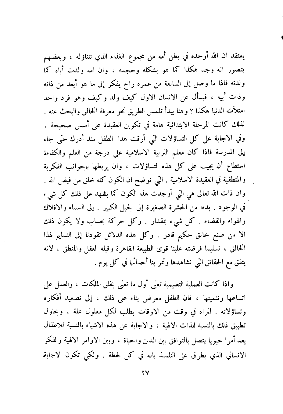 وإذا كانت العملية التعليمية تعنى أول ما تعنى بخلق الملكات، والعمل على اتساعها وتنميتها، فإن الطفل معرض بناء على ذلك، إلى تصعيد أفكاره وتساؤلاته. لنراه في وقت من الأوقات يطلب لكل معلول علة، ويحاول تطبيق ذلك بالنسبة للذات الإلهية، والإجابة عن هذه الأشياء بالنسبة للأطفال يعد أمرا حيويا يتصل بالتوافق بين الدين والحياة، وبين الأوامر الإلهية والفكر الإنساني الذي يطرق على التلميذ بابه في كل لحظة، ولكي تكون الإجابة