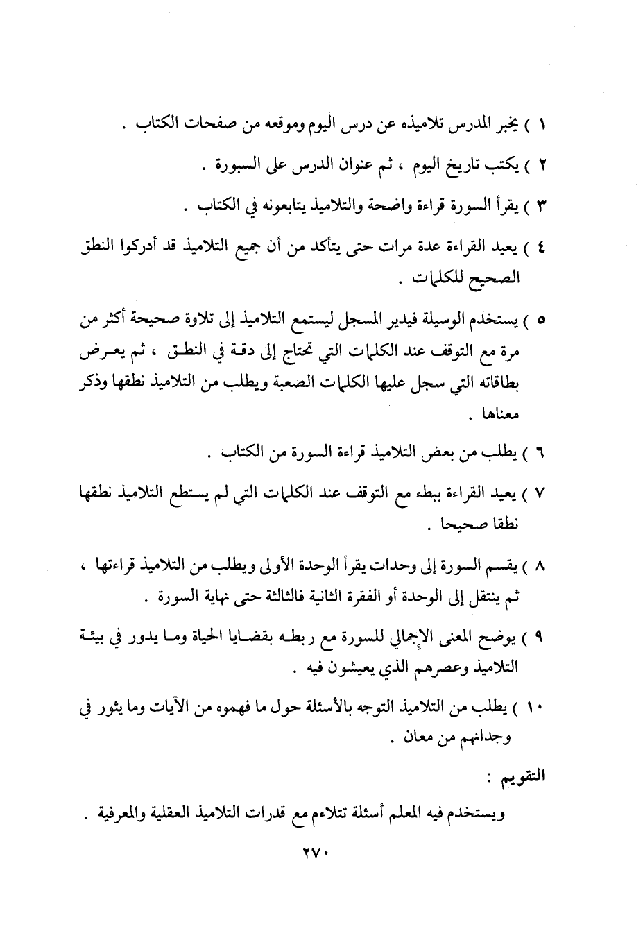 8- يقسم السورة إلى وحدات يقرأ الوحدة الأولى ويطلب من التلاميذ قراءتها، ثم ينتقل إلى الوحدة أو الفقرة الثانية فالثالثة حتى نهاية السورة.