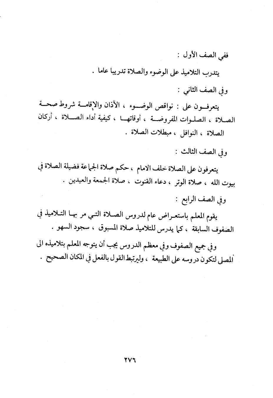 وفي جميع الصفوف وفي معظم الدروس يجب أن يتوجه المعلم بتلاميذه إلى المصلى لتكون دروسه على الطبيعة، وليرتبط القول بالفعل في المكان الصحيح.