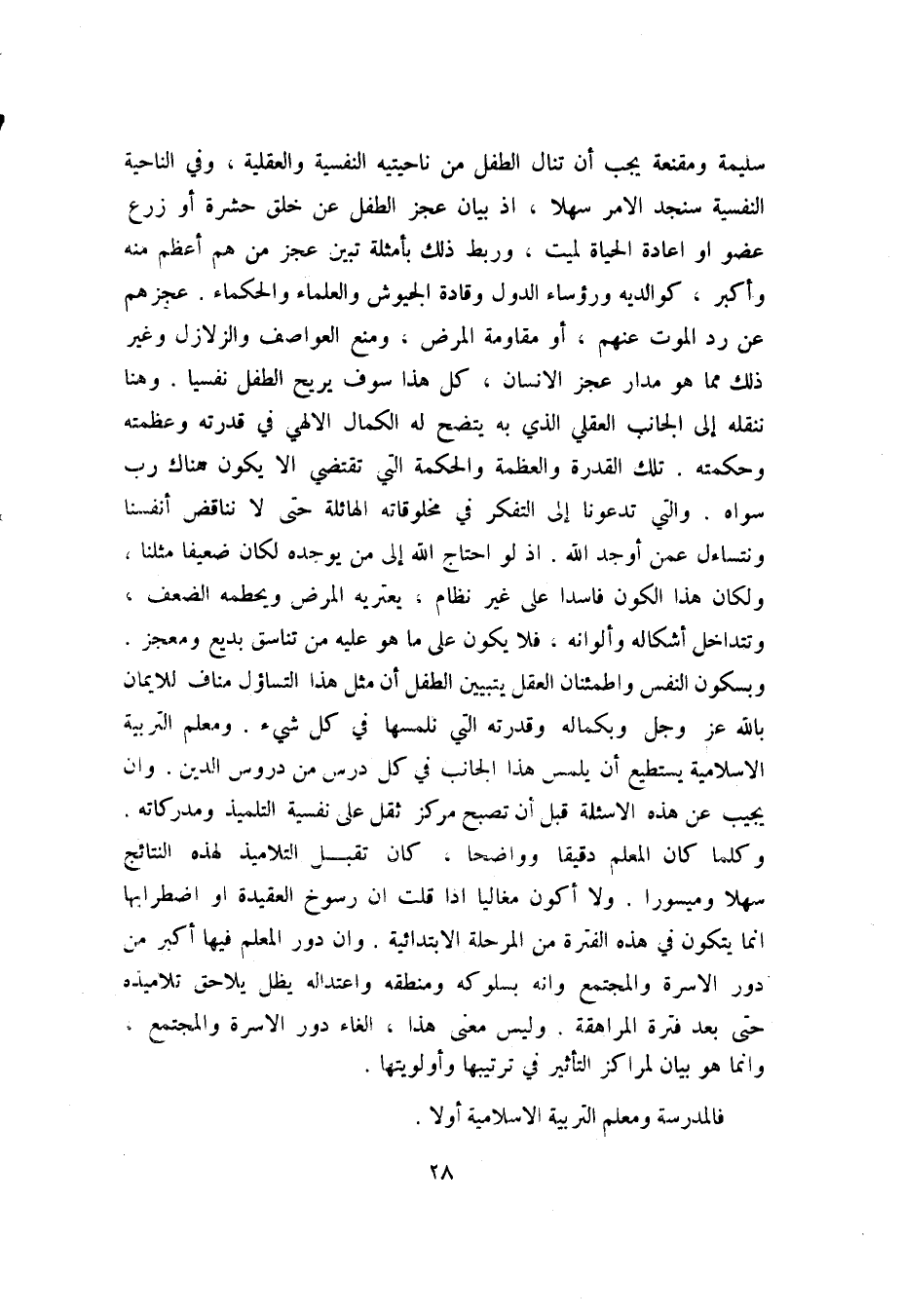 وبسكون النفس واطمئنان العقل يتبين الطفل أن مثل هذا التساؤل مناف للإيمان بالله عز وجل وبكماله وقدرته التي نلمسها في كل شيء. ومعلم التربية الإسلامية يستطيع أن يلمس هذا الجانب في كل درس من دروس الدين. وأن يجيب عن هذه الأسئلة قبل أن تصبح مركز ثقل عن نفسية التلميذ ومدركاته. وكلما كان المعلم دقيقا وواضحا، كان تقبل التلاميذ لهذه النتائج سهلا وميسورا. ولا أكون مغاليا إذا قلت أن رسوخ العقيدة أو اضطرابها إنما يتكون في هذه الفترة من المرحلة الابتدائية. وأن دور المعلم فيها أكبر من دور الأسرة والمجتمع وأنه بسلوكه ومنطقه واعتداله يظل يلاحق تلاميذه حتى بعد فترة المراهقة. وليس معنى هذا، إلغاء دور الأسرة والمجتمع. وإنما هو بيان لمراكز التأثير في ترتيبها وأولويتها.