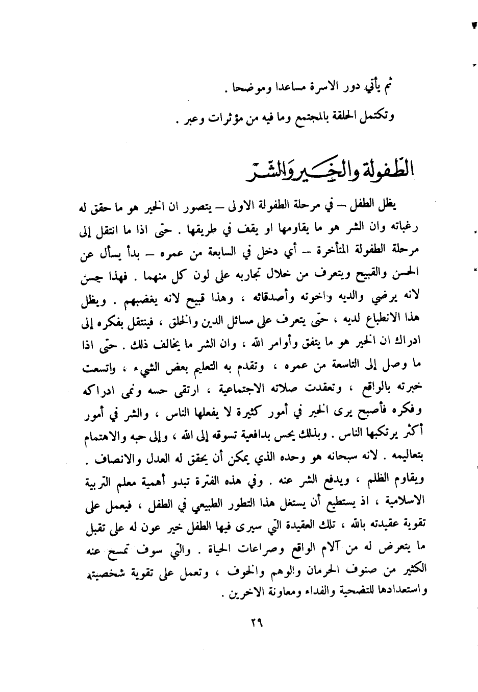 يظل الطفل -في مرحلة الطفولة الأولى- يتصور أن الخير هو ما حقق له رغباته وأن الشر هو ما يقاومها أو يقف في طريقها. حتى إذا ما انتقل إلى مرحلة الطفولة المتأخرة -أي: دخل في السابعة من عمره- بدأ يسأل عن الحسن والقبيح ويتعرف من خلال تجاربه على لون كل منهما. فهذا حسن لأنه يرضي والديه وأخوته وأصدقائه، وهذا قبيح لأنه يغضبهم. ويظل هذا الانطباع لديه، حتى يتعرف على مسائل الدين والخلق، فينتقل بفكره إلى إدراك أن الخير هو ما يتفق وأوامر الله، وأن الشر ما يخالف ذلك. حتى إذا ما وصل إلى التاسعة من عمره، وتقدم به التعليم بعض الشيء، واتسعت خبرته بالواقع، وتعقدت صلاته الاجتماعية، ارتقى حسه ونمى إدراكه وفكره فأصبح يرى الخير في أمور كثيرة لا يفعلها الناس، والشر في أمور أكثر يرتكبها الناس. وبذلك يحس بدافعية تسوقه إلى الله، وإلى حبه والاهتمام بتعاليمه؛ لأنه سبحانه هو وحده الذي يمكن أن يحقق له العدل والإنصاف. ويقاوم الظلم، ويدفع الشر عنه. وفي هذه الفترة تبدو أهمية معلم التربية الإسلامية، إذ يستطيع أن يستغل هذا التطور الطبيعي في الطفل، فيعمل على تقوية عقيدته بالله، تلك العقيدة التي سيرى فيها الطفل خير عون له على تقبل ما يتعرض له من آلام الواقع وصراعات الحياة. والتي سوف تمسح عنه الكثير من صنوف الحرمان والوهم والخوف، وتعمل على تقوية شخصيته واستعدادها للتضحية والفداء ومعاونة الآخرين.
