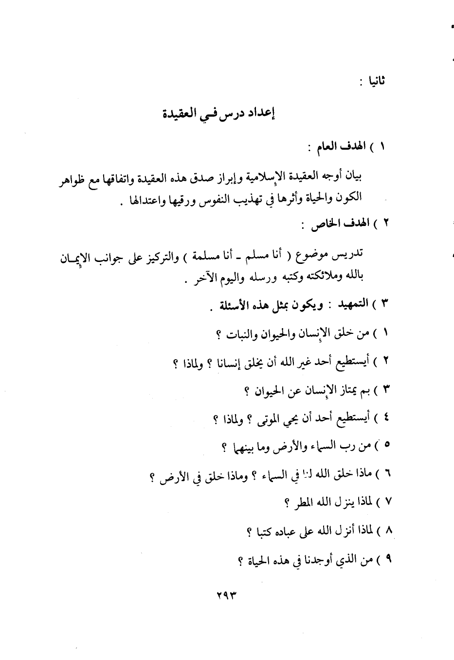 تدريس موضوع "أنا مسلم - أنا مسلمة" والتركيز على جوانب الإيمان بالله وملائكته وكتبه ورسله واليوم الآخر.