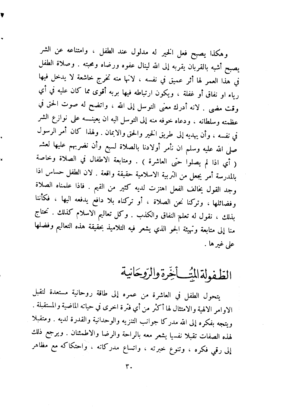 وهكذا يصبح فعل الخير له مدلول عند الطفل، وامتناعه عن الشر يصبح أشبه بالقربان يقربه إلى الله لينال عفوه ورضاه ومحبته. وصلاة الطفل في هذا العمر لها أثر عميق في نفسه؛ لأنها منه تخرج خاشعة لا يدخل فيها رياء أو نفاق أو غفلة، ويكون ارتباطه فيها بربه أقوى مما كان عليه في أي وقت مضى؛ لأنه أدرك معنى التوسل إلى الله، واتضح له صوت الحق في عظمته وسلطانه، ودعاه خوفه منه إلى التوسل إليه أن يعينه على نوازع الشر في نفسه، وأن يهديه إلى طريق الخير والإيمان، ولهذا كان أمر الرسول -صلى الله عليه وسلم- أن نأمر أولادنا بالصلاة لسبع وأن نضربهم عليها لعشر "أي: إذا لم يصلوا حتى العاشرة". ومتابعة الأطفال في الصلاة وخاصة بالمدرسة أمر يجعل من التربية الإسلامية حقيقة واقعة؛ لأن الطفل حساس إذا وجد القول يخالف الفعل اهتزت لديه كثير من القيم. فإذا علمناه الصلاة وفضائلها، وتركنا نحن الصلاة، أو تركناه بلا دافع يدفعه إليها، فكأننا بذلك، نقول له تعلم النفاق والكذب. وكل تعاليم الإسلام كذلك. تحتاج منا إلى متابعة وتهيئة الجو الذي يشعر فيه التلاميذ بحقيقة هذه التعاليم وفضلها على غيرها.