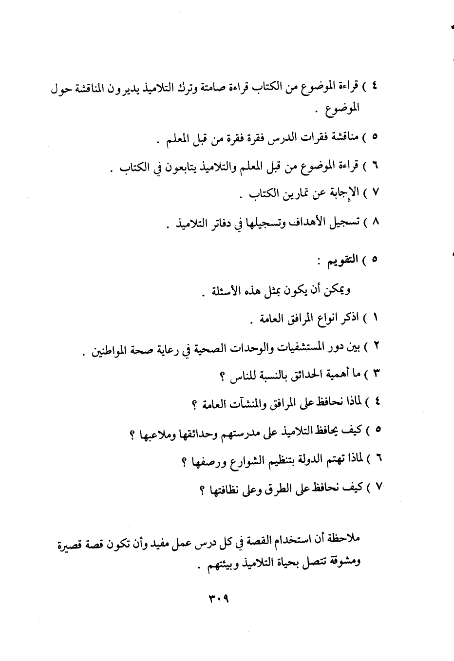 ملاحظة: إن استخدام القصة في كل درس عمل مفيد, وأن تكون قصة قصيرة ومشوقة تتصل بحياة التلاميذ وبيئتهم.